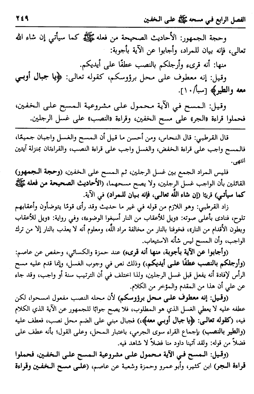 قال القرطبي: قال النحاس، ومن أحسن ما قيل أن المسح والغسل واجبان جميعا، فالمسح واجب على قراءة الخفض، والغسل واجب على قراءة النصب، والقراءتان بمنزلة آيتين. انتهى.