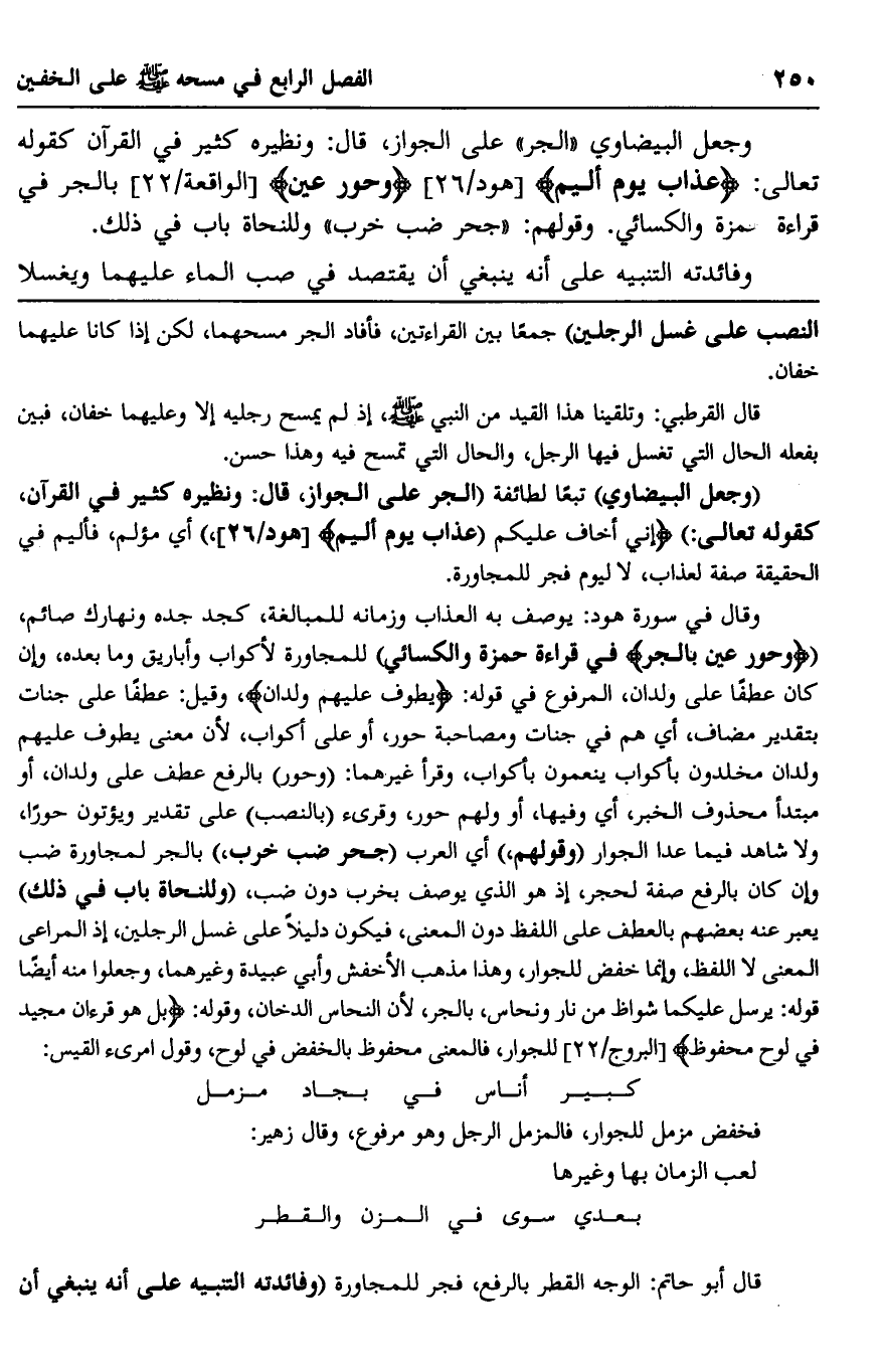 النصب على غسل الرجلين" جمعا ين القراءتين، فأفاد الجر مسحهما، لكن إذا كانا عليهما خفان.
