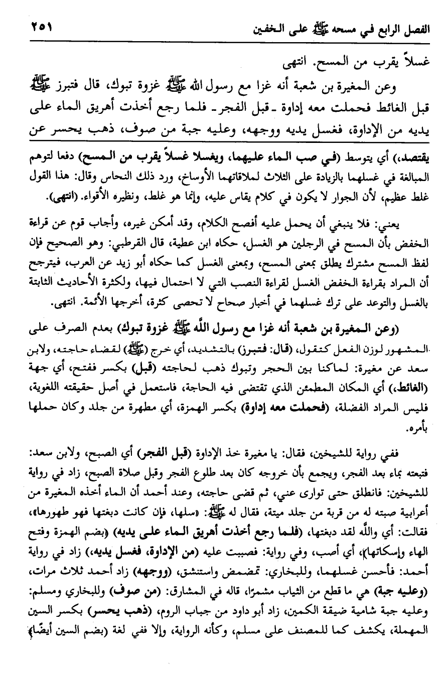 "وعن المغيرة بن شعبة أنه غزا مع رسول الله صلى الله عليه وسلم غزوة تبوك" بعدم الصرف على المشهور لوزن الفعل كتقول، "قال: فتبرز" بالتشديد، أي خرج "صلى الله عليه وسلم" لقضاء حاجته، ولابن سعد عن مغيرة: لما كنا بين الحر وتبوك ذهب لحاجته "قبل" بكسر ففتح، أي جهة "الغائط" أي المكان المطمئن الذي تقضى فيه الحاجة، فاستعمل في أصل حقيقته اللغوية، فليس المراد الفضلة، "فحملت معه إداوة" بكسر الهمزة، أي مطهرة من جلد وكان حملها بأمره.