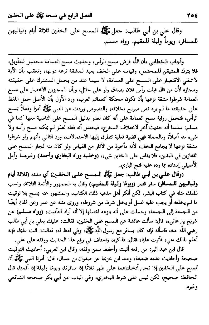 وقال علي بن أبي طالب: جعل صلى الله عليه وسلم المسح على الخفين ثلاثة أيام ولياليهن للمسافر، ويوما وليلة للمقيم. رواه مسلم.