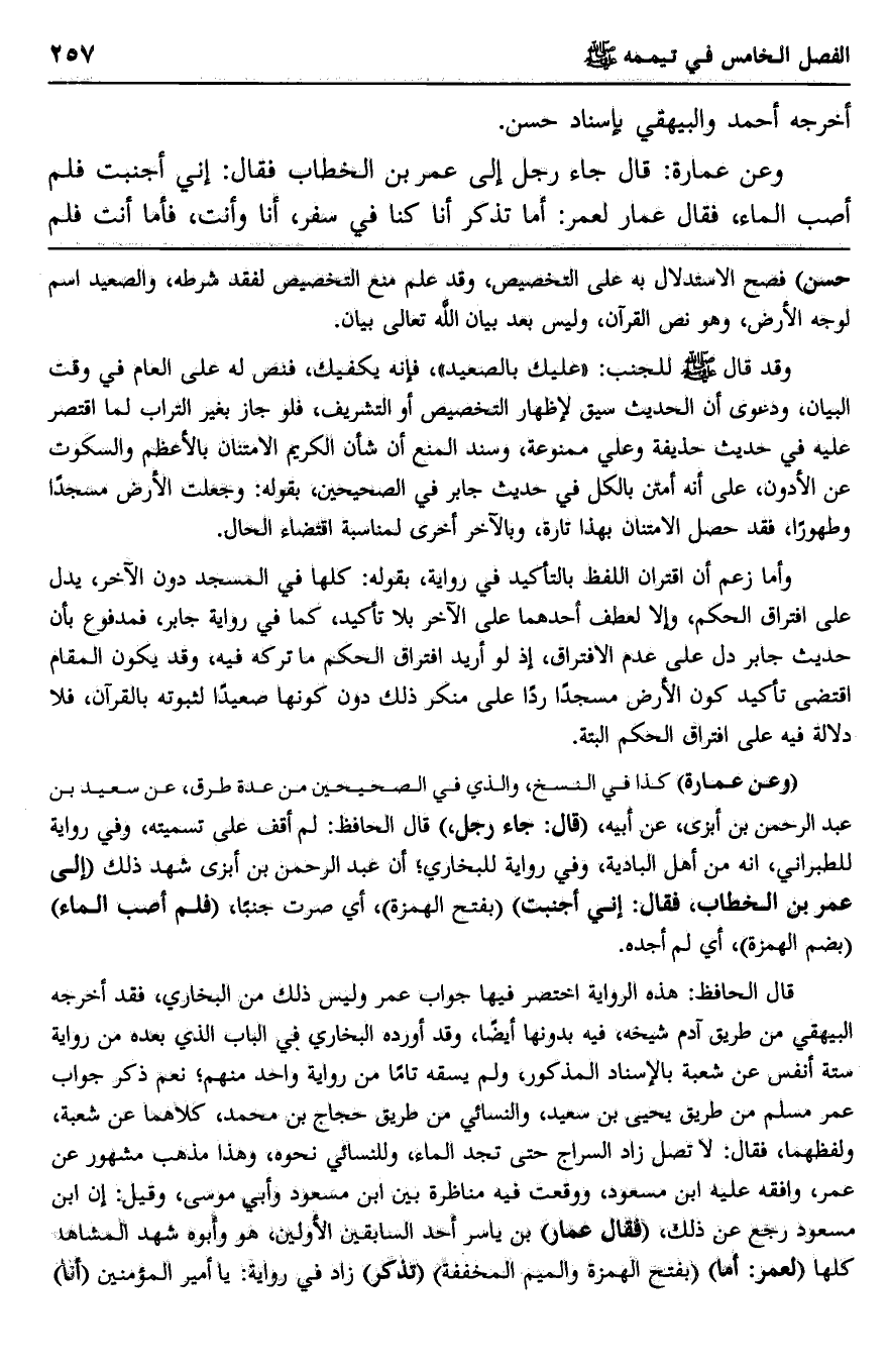 وعن عمارة: قال جاء رجل إلى عمر بن الخطاب فقال: إني أجنبت فلم أصب الماء، فقال عمار لعمر: أما تذكر أنا كنا في سفر، أنا وأنت، فأما أنت فلم