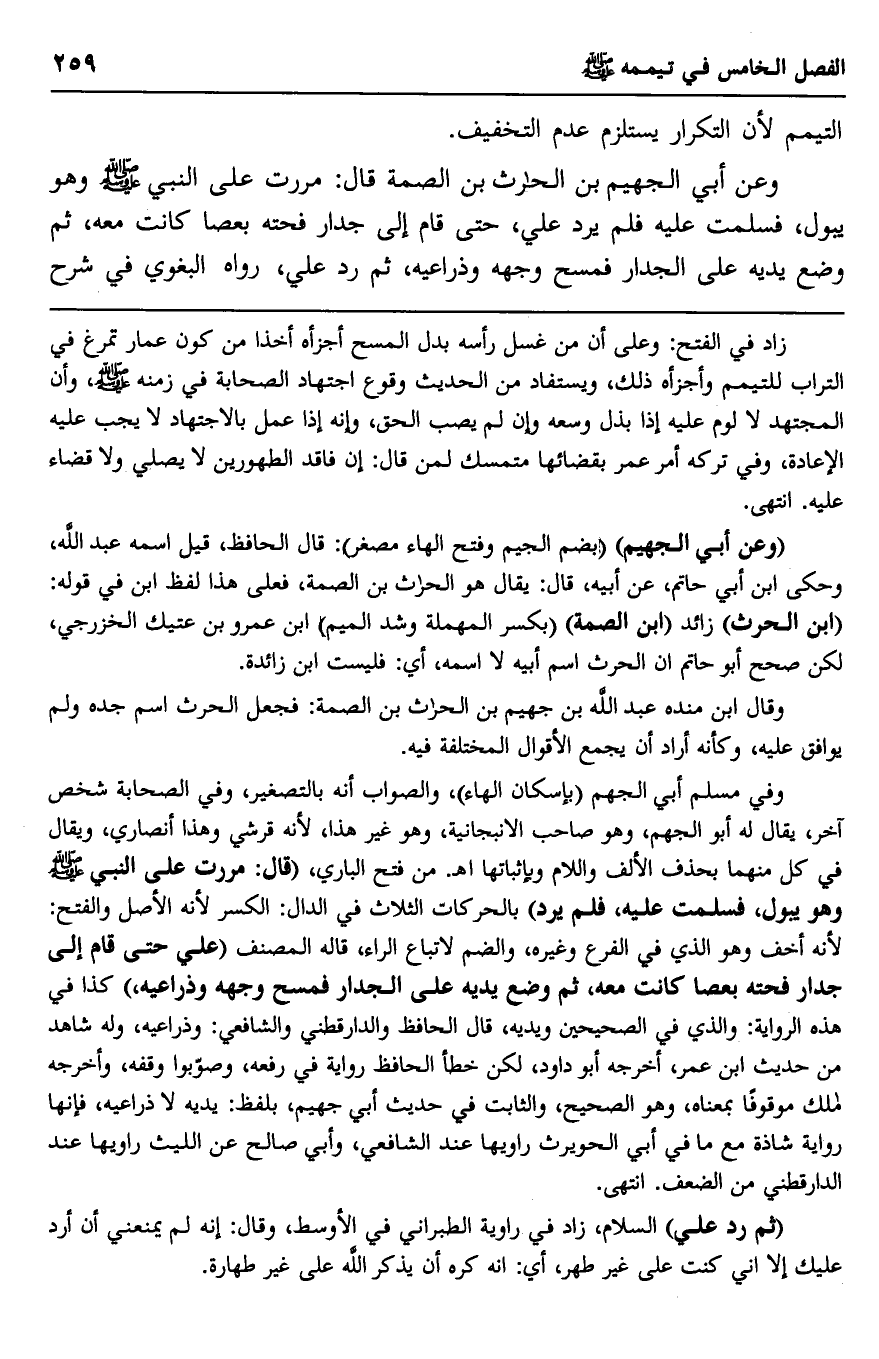 وفي مسلم أبي الجهم "بإسكان الهاء" والصواب أنه بالتصغير، وفي الصحابة شخص آخر، يقال له أبو الجهم، وهو صاحب الانبجانية، وهو غير هذا، لأنه قرشي وهذا أنصاري، ويقال في كل منهما بحذف الألف واللام وبإثباتها. ا. هـ. من فتح الباري "قال: مررت على النبي صلى الله عليه وسلم وهو يبول، فسلمت عليه، فلم يرد" بالحركات الثلاث في الدال: الكسر لأنه الأصل والفتح لأنه أخف وهو الذي في الفرع وغيره، والضم لاتباع الراء، قاله المصنف. "عليّ حتى قام إلى جدار فحته بعصا كانت معه، ثم وضع يديه على لجدار فمسح وجهه وذراعيه" كذا في هذه الرواية, والذي في الصحيحين: ويديه، قال الحافظ والدارقطني والشافعي: وذراعيه، وله شاهد من حديث ابن عمر، أخرجه أبو داود, لكن خطأ الحافظ رواية في رفعه، وصوبوا وقفه، وأخرجه مالك موقوفا بمعناه، وهو الصحيح، والثابت في حديث أبي جهيم، بلفظ: يديه لا ذراعيه، فإنها رواية شاذة مع ما في أبي الحويرث راويها عند الشافعي، وأبي صالح عن الليث راويها عند الدارقطني من الضعف. انتهى.