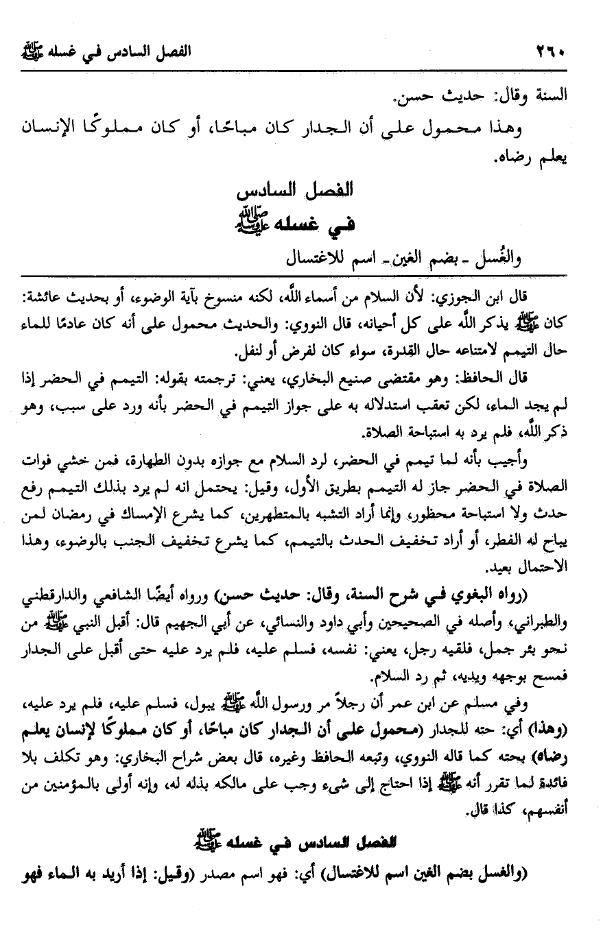 "رواه البغوي في شرح السنة، وقال: حديث حسن" ورواه أيضا الشافعي والدارقطني والطبراني، وأصله في الصحيحين وأبي داود والنسائي، عن أبي الجهيم قال: أقبل النبي صلى الله عليه وسلم من نحو بئر جمل، فلقيه رجل، يعني: نفسه، فسلم عليه، فلم يرد عليه حتى أقبل على الجدار فمسح بوجهه ويديه، ثم رد السلام.