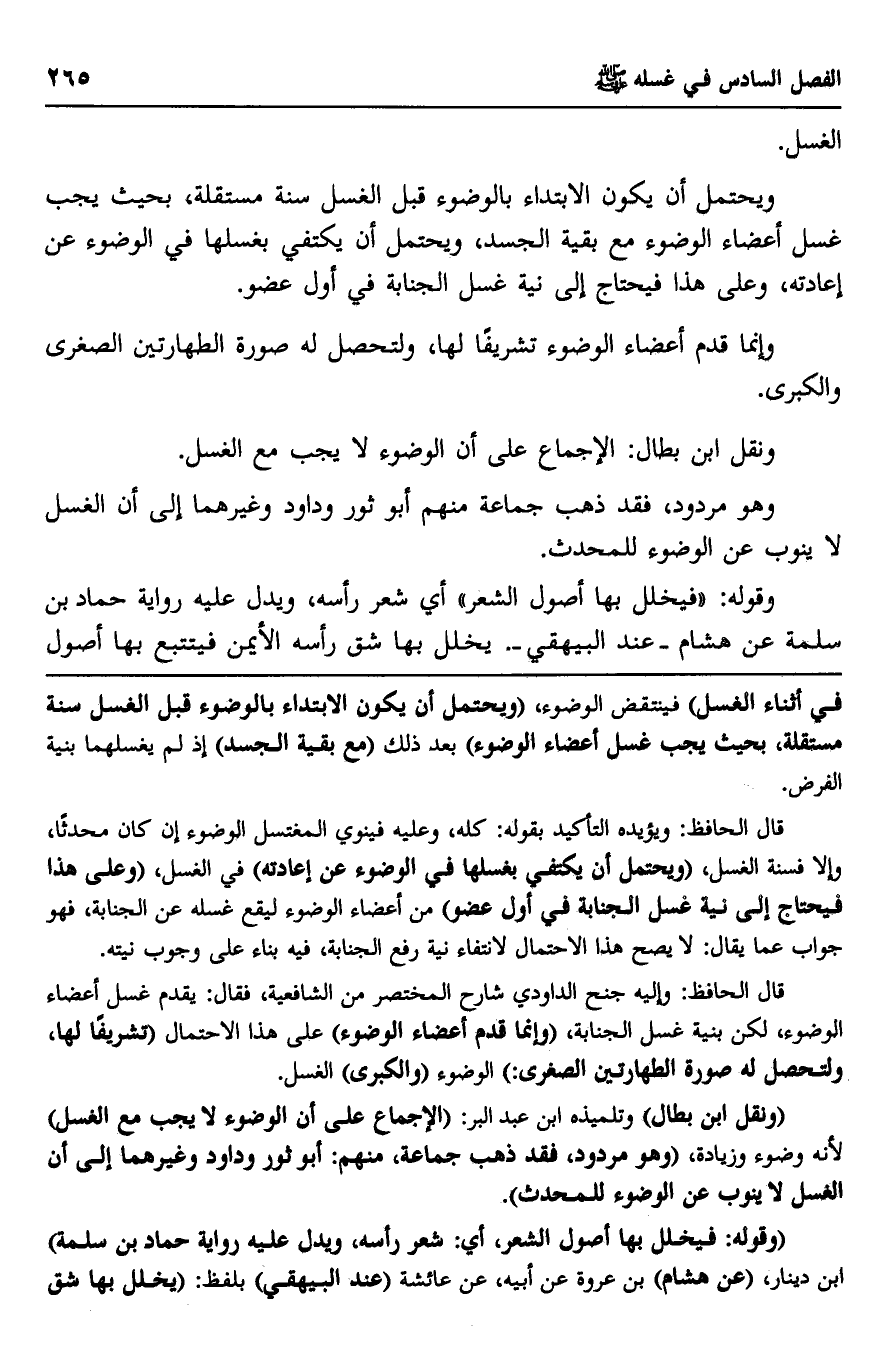 "ونقل ابن بطال" وتلميذه ابن عبد البر: "الإجماع على أن الوضوء لا يجب مع الغسل" لأنه وضوء وزيادة، "وهو مردود، فقد ذهب جماعة، منهم: أبو ثور وداود وغيرهما إلى أن الغسل لا ينوب عن الوضوء للمحدث".