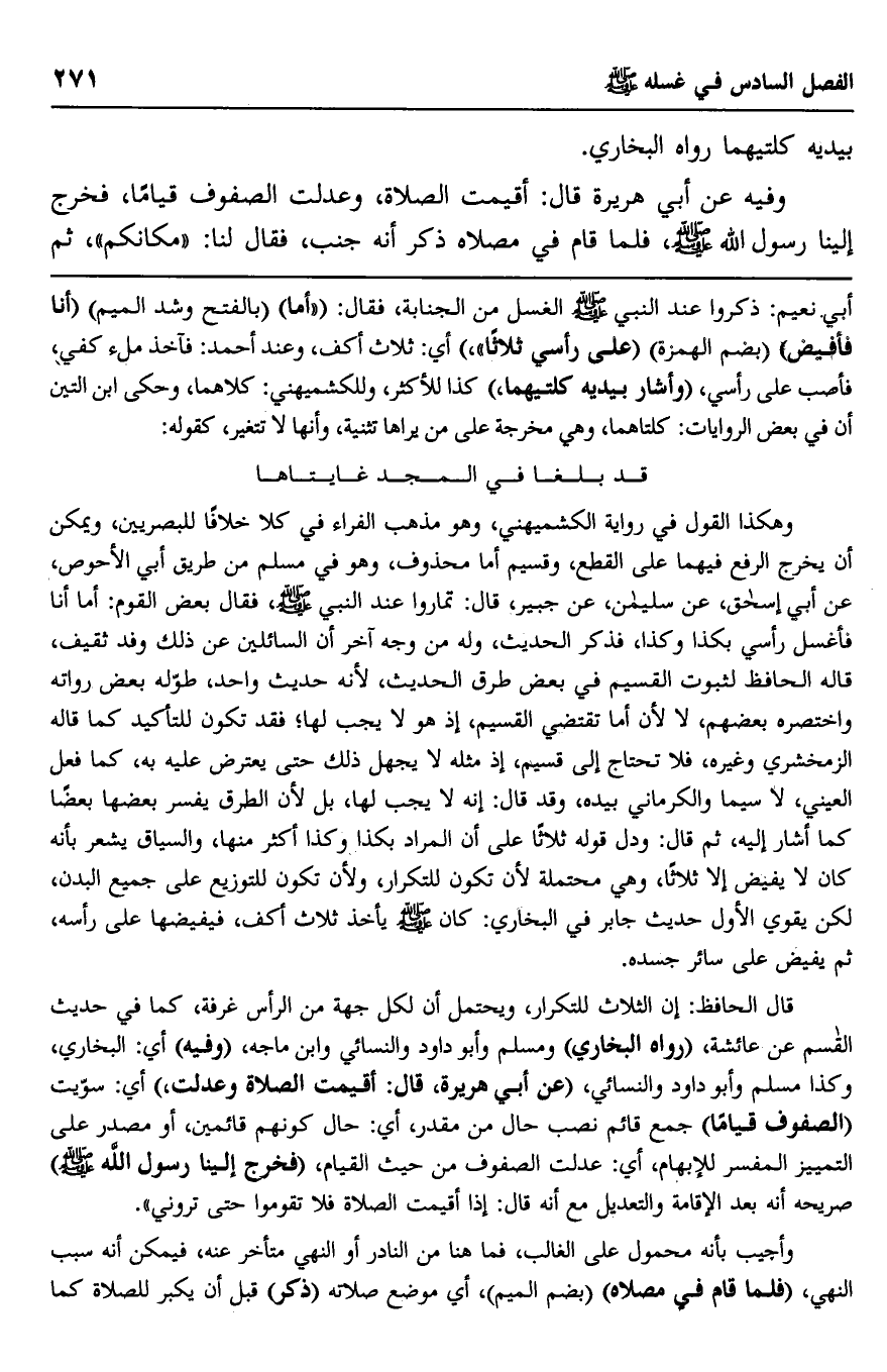 قال الحافظ: إن الثلاث للتكرار، ويحتمل أن لكل جهة من الرأس غرفة، كما في حديث القاسم عن عائشة، "رواه البخاري" ومسلم وأبو داود والنسائي وابن ماجه، "وفيه" أي: البخاري، وكذا مسلم وأبو داود والنسائي، "عن أبي هريرة" قال: أقيمت الصلاة وعدلت" أي: سويت "الصفوف قياما" جمع قائم نصب حال من مقدر، أي: حال كونهم قائمين، أو مصدر على التمييز المفسر للإبهام، أي: عدلت الصفوف من حيث القيام، "فخرج إلينا رسول الله صلى الله عليه وسلم" صريحه أنه بعد الإقامة والتعديل مع أنه قال: "إذا أقيمت الصلاة فلا تقوموا حتى تروني".