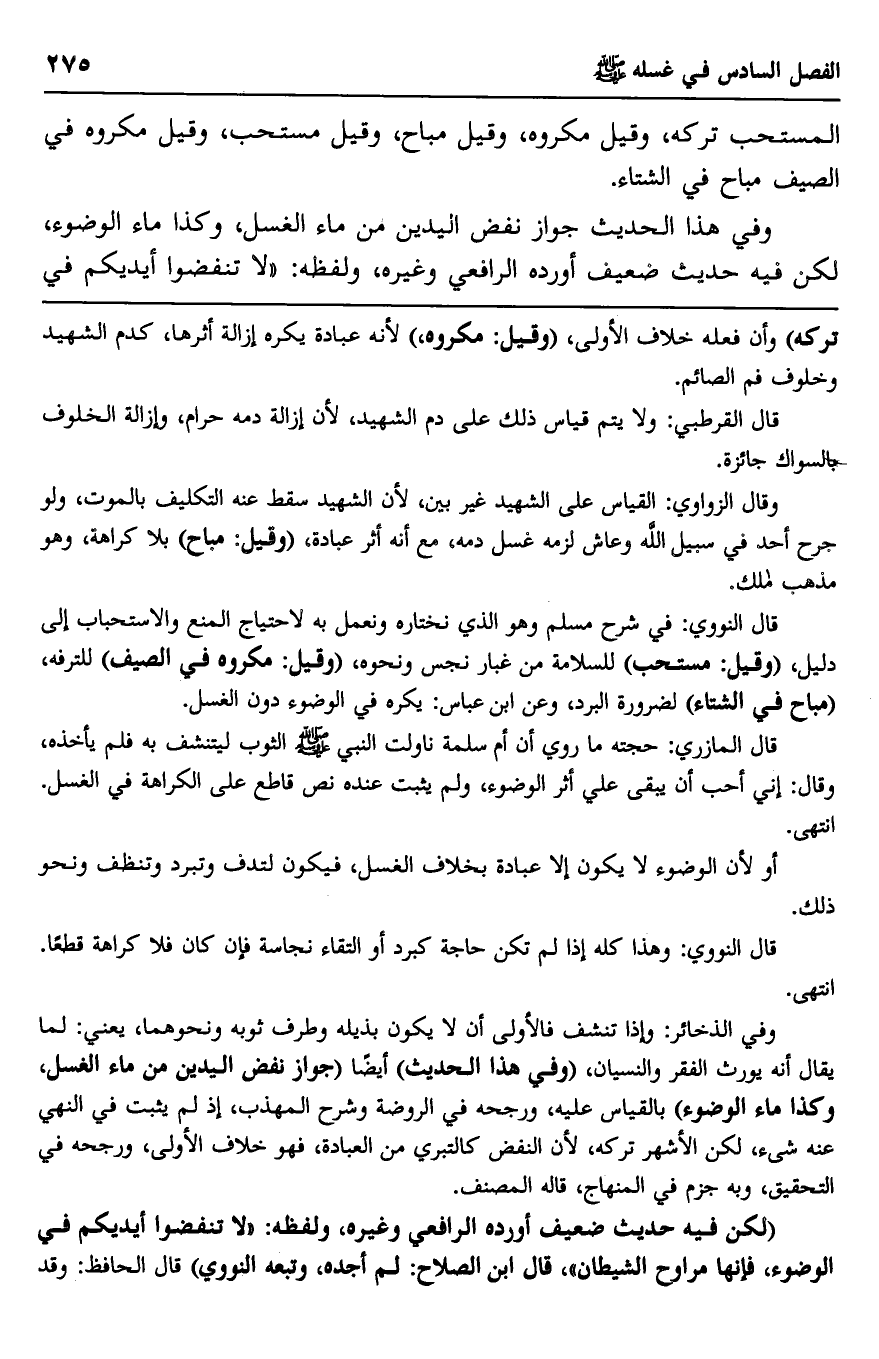 "لكن فيه حديث ضعيف أورده الرافعي وغيره، ولفظه: "لا تنفضوا أيديكم في الوضوء فإنها مراوح الشيطان"، قال ابن الصلاح: لم أجده، وتبعه النووي" قال الحافظ: وقد