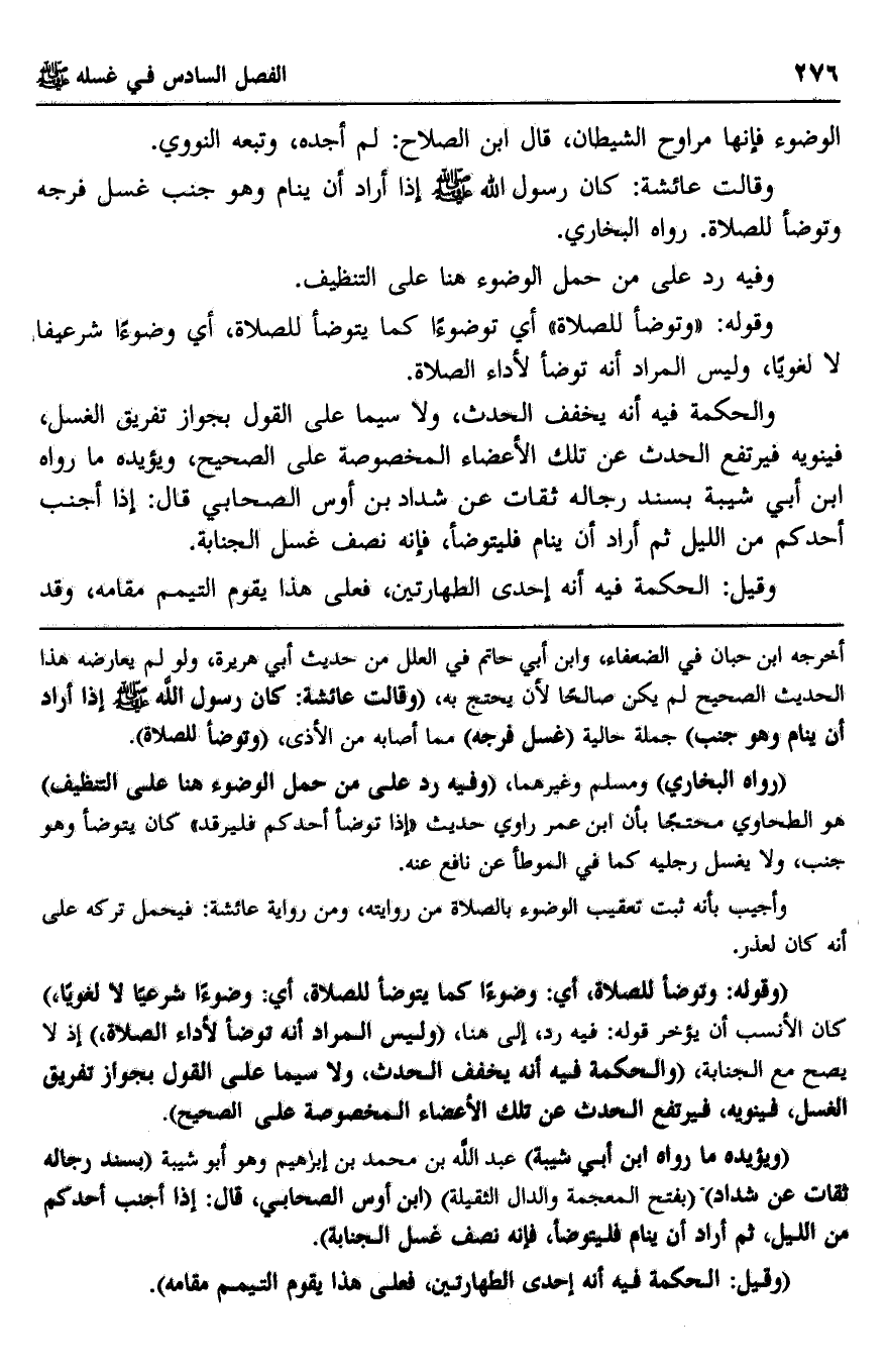 "ويؤيده ما رواه ابن أبي شيبة" عبد الله بن محمد بن إبراهيم وهو أبو شيبة "بسند رجاله ثقات عن شداد" "بفتح المعجمة والدال الثقيلة" "ابن أوس الصحابي، قال: إذا أجنب أحدكم من الليل، ثم أراد أن ينام فليتوضأ، فإنه نصف غسل الجنابة".