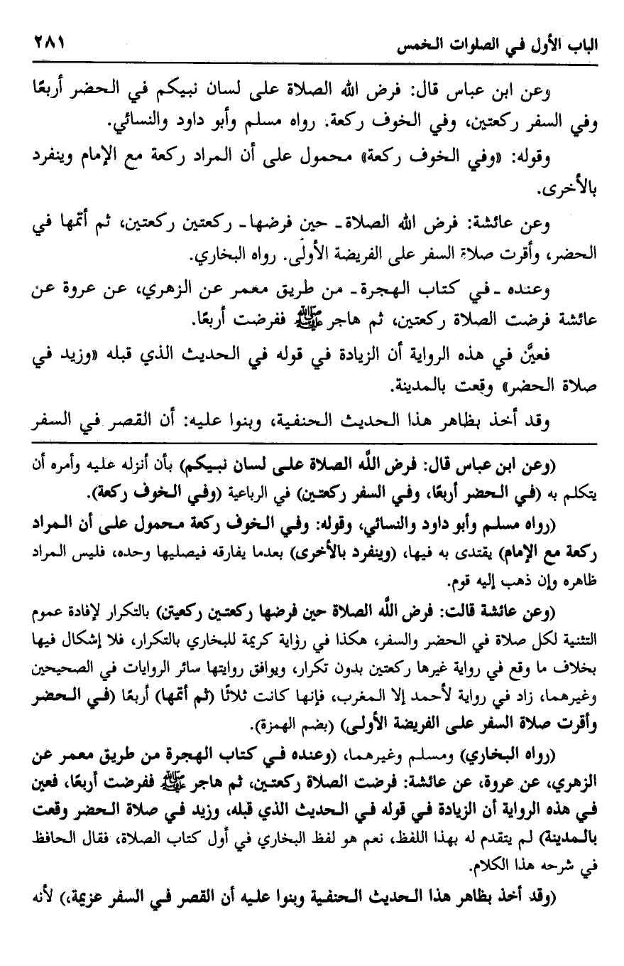 وعن ابن عباس قال: فرض الله الصلاة على لسان نبيكم في الحضر أربعا وفي السفر ركعتين، وفي الخوف ركعة. رواه مسلم وأبو داود والنسائي.