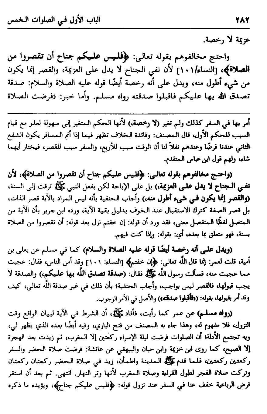 "واحتج مخالفوهم بقوله تعالى: {فَلَيْسَ عَلَيْكُمْ جُنَاحٌ أَنْ تَقْصُرُوا مِنَ الصَّلَاةِ} ، لأن نفي الجناح لا يدل على العزيمة، بل على الإباحة لكن بفعل النبي صلى الله عليه وسلم ترقت إلى السنة، "والقصر إنما يكون في شيء أطول منه،" وأجاب الحنفية بأنه ليس المراد بالآية قصر الذات، بل قصر الصفة كترك الاستقبال عند الخوف بدليل بقية الآية، ورده ابن جرير بأن الآية من المتصل لفظا المنفصل معنى، فقد ورد أن قوله: {إِنْ خِفْتُمْ} نزل بعد قوله: {أَنْ تَقْصُرُوا مِنَ الصَّلَاةِ} بسنة، فهو متعلق بما بعده، أي: بقوله: {وَإِذَا كُنْتَ فِيهِمْ} .