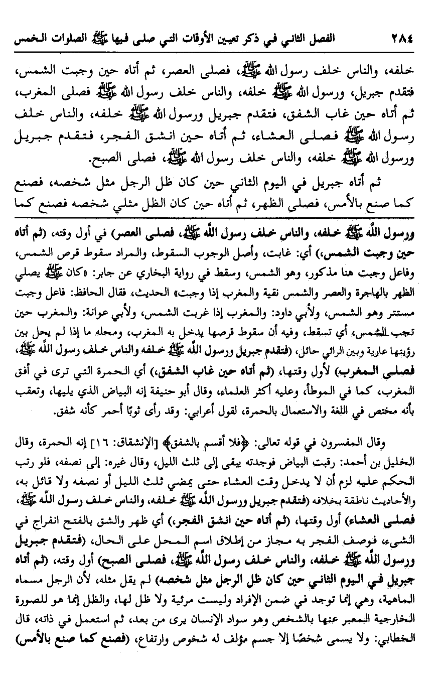 ثم أتاه جبريل في اليوم الثاني حين كان ظل الرجل مثل شخصه، فصنع كما صنع بالأمس، فصلى الظهر، ثم أتاه حين كان الظل مثلي شخصه فصنع كما