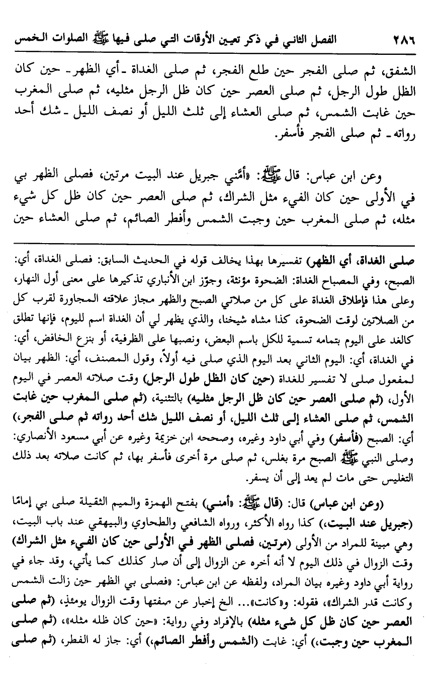 وعن ابن عباس: قال صلى الله عليه وسلم: "أمَّني جبريل عند البيت مرتين، فصلى الظهر بي في الأولى حين كان الفيء مثل الشراك، ثم صلى العصر حين كان ظل كل شيء مثله، ثم صلى المغرب حين وجبت الشمس وأفطر الصائم، ثم صلى العشاء حين