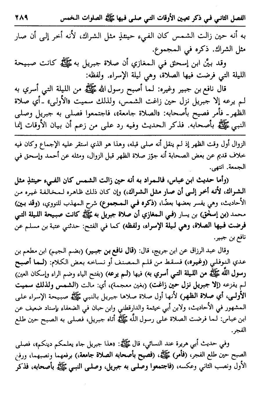 قال نافع بن جبير وغيره: لما أصبح رسول الله صلى الله عليه وسلم من الليلة التي أسري به لم يرعه إلا جبريل نزل حين زاغت الشمس، ولذلك سميت "الأولى" -أي صلاة الظهر- فأمر فصيح بأصحابه: "الصلاة جامعة" فاجتمعوا فصلى به جبريل وصلى النبي صلى الله عليه وسلم بأصحابه. فذكر الحديث وفيه رد على من زعم أن بيان الأوقات إنما