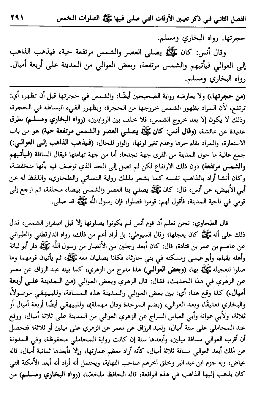 وقال أنس: كان صلى الله عليه وسلم يصلي العصر والشمس مرتفعة حية، فيذهب الذاهب إلى العوالي فيأتيهم والشمس مرتفعة، وبعض العوالي من المدينة على أربعة أميال. رواه البخاري ومسلم.