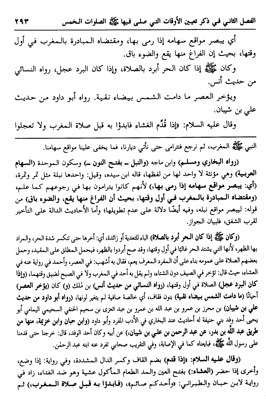 "رواه البخاري ومسلم" وابن ماجه "والنبل بفتح النون" وسكون الموحدة "السهام العربية" وهي مؤنثة لا واحد لها من لفظها، قاله ابن سيده، وقيل: واحدها نبلة مثل تمر وتمرة، "أي: يبصر مواقع سهامه إذا رمى بها" لأنهم كانوا يترامون بها في رجوعهم كما علم، "ومقتضاه المبادرة بالمغرب في أول وقتها، بحيث أن الفراغ منها يقع، والضوء باق" من قوله: ليبصر مواقع نبله، وفيه أيضا دلالة على عدم تطويلها، وأما الأحاديث الدالة على التأخير لقرب الشفق، فلبيان الجواز.