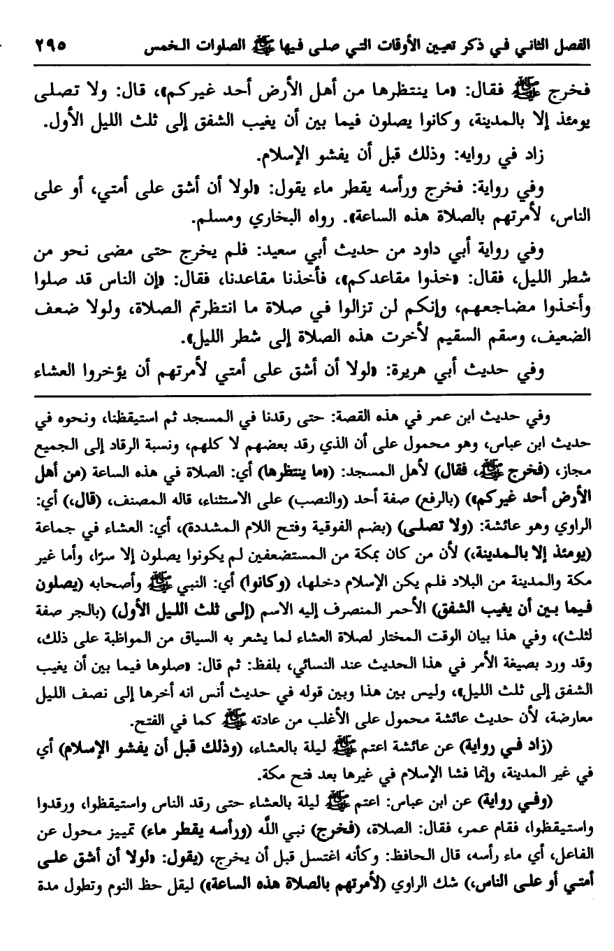 فخرج صلى الله عليه وسلم فقال: "ما ينتظرها من أهل الأرض أحد غيركم". قال: ولا تصلي يومئذ بالمدينة، وكانوا يصلون فيما بين أن يغيب الشفق إلى ثلث الليل الأول.