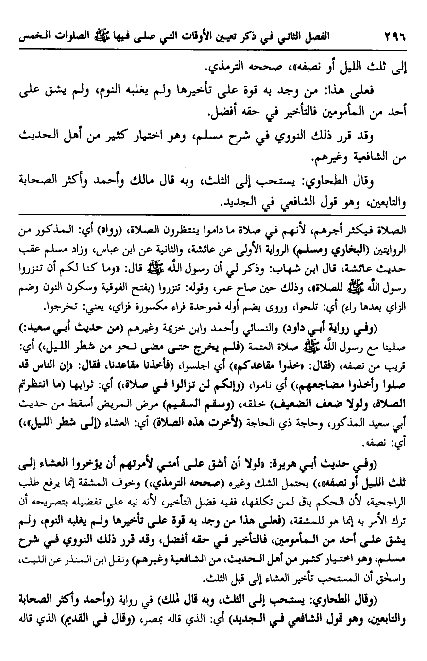 "وفي حديث أبي هريرة": "لولا أن أشق على أمتي لأمرتهم أن يؤخروا العشاء إلى ثلث الليل أو نصفه" يحتمل الشك وغيره "صححه الترمذي" وخوف المشقة إنما يرفع طلب الراجحية، لأن الحكم باق لمن تكلفها، ففيه فضل التأخير، لأنه نبه على تفضيله بتصريحه أن ترك الأمر به إنما هو للمشقة، "فعلى هذا من وجد به قوة على تأخيرها ولم يغلبه النوم، ولم يشق على أحد من المأمومين، فالتأخير في حقه أفضل، وقد قرر ذلك النووي في شرح مسلم، وهو اختيار كثير من أهل الحديث، من الشافعية وغيرهم" ونقل ابن المنذر عن الليث، وإسحاق أن المستحب تأخير العشاء إلى قبل الثلث.