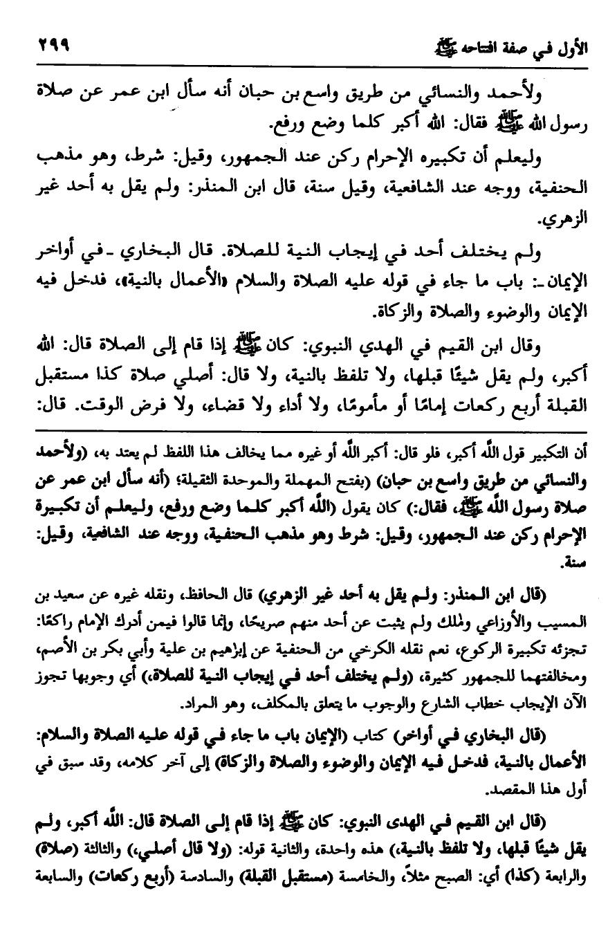 وقال ابن القيم في الهدي النبوي: كان صلى الله عليه وسلم إذا قام إلى الصلاة قال: "الله أكبر". ولم يقل شيئا قبلها، ولا تلفظ بالنية، ولا قال: أصلي صلاة كذا مستقبل القبلة أربع ركعات إماما أو مأموما، ولا أداء ولا قضاء، ولا فرض الوقت. قال: