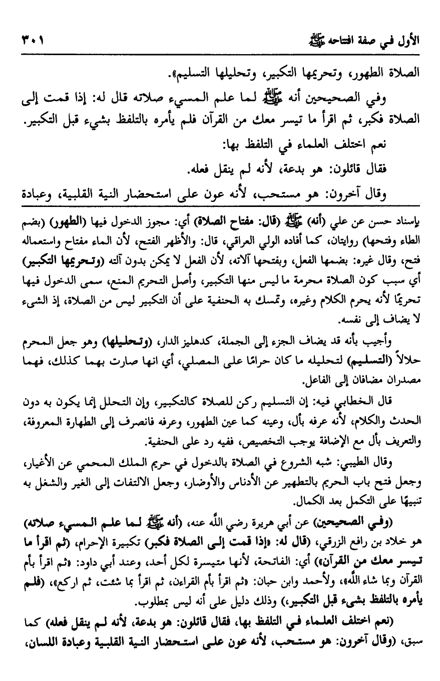 وفي الصحيحين أنه صلى الله عليه وسلم لما علم المسيء صلاته قال له: "إذا قمت إلى الصلاة فكبر، ثم اقرأ ما تيسر معك من القرآن". فلم يأمره بالتلفظ بشيء قبل التكبير.