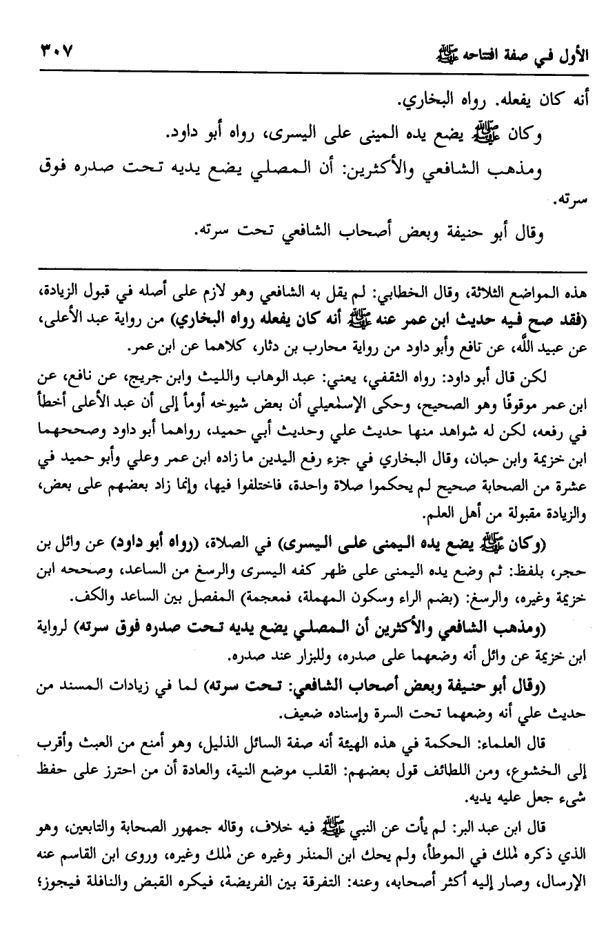 "ومذهب الشافعي والأكثرين أن المصلي يضع يديه تحت صدره فوق سرته" لرواية ابن خزيمة عن وائل أنه وضعهما على صدره، وللبزار عند صدره.