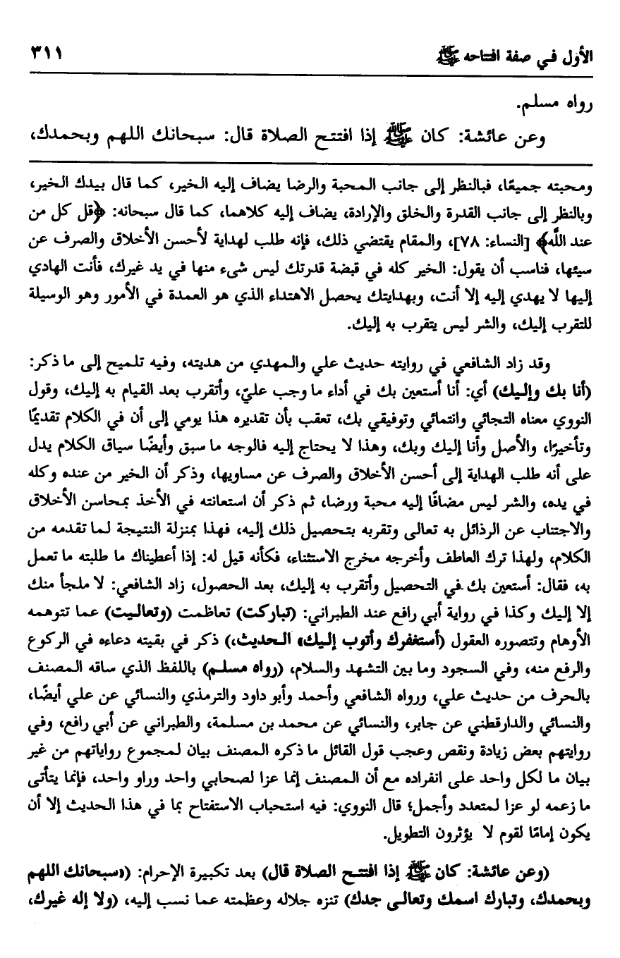 وقد زاد الشافعي في روايته حديث علي والمهدي من هديته، وفيه تلميح إلى ما ذكر: "أنا بك وإليك" أي: أنا أستعين بك في أداء ما وجب علي، وأتقرب بعد القيام به إليك، وقول النووي معناه التجائي وانتمائي وتوفيقي بك، تعقب بأن تقديره هذا يومئ إلى أن في الكلام تقديما وتأخيرا، والأصل وأنا إليك وبك، وهذا لا يحتاج إليه فالوجه ما سبق وأيضا سياق الكلام يدل على أنه طلب الهداية إلى أحسن الأخلاق والصرف عن مساويها، وذكر أن الخير من عنده وكله في يده، والشر ليس مضافا إليه محبة ورضا، ث ذكر أن استعانته في الأخذ بمحاسن الأخلاق والاجتناب عن الرذائل به تعالى وتقربه بتحصيل ذلك إليه، فهذا بمنزلة النتيجة لما تقدمه من الكلام، ولهذا ترك العاطف وأخرجه مخرج الاستثناء، فكأنه قيل له: إذا أعطيناك ما طلبته ما تعمل به، فقال: أستعين بك في التحصيل وأتقرب به إليك، بعد الحصول، زاد الشافعي: "لا ملجأ منك إلا إليك". وكذا في رواية أبي رافع عند الطبراني. "تباركت" تعاظمت "وتعاليت" عما تتوهمه الأوهام وتتصوره العقول "أستغفرك وأتوب إليك". الحديث. ذكر في بقيته دعاءه في الركوع والرفع منه، وفي السجود وما بين التشهد والسلام، "رواه مسلم" باللفظ الذي ساقه المصنف بالحرف من حديث علي، ورواه الشافعي وأحمد وأبو داود والترمذي والنسائي عن علي أيضا، والنسائي والدارقطني عن جابر، والنسائي عن محمد بن مسلمة، والطبراني عن أبي رافع، وفي روايتهم بعض زيادة ونقص وعجب قول القائل، ما ذكره المصنف بيان لمجموع رواياتهم من غير بيان ما لكل واحد على انفراده مع أن المصنف إنما عزا لصحابي واحد وراو واحد، فإنما يتأتى ما زعمه لو عزا لمتعدد وأجمل، قال النووي: فيه استحباب الاستفتاح بما في هذا الحديث إلا أن يكون إماما لقوم لا يؤثرون التطويل.