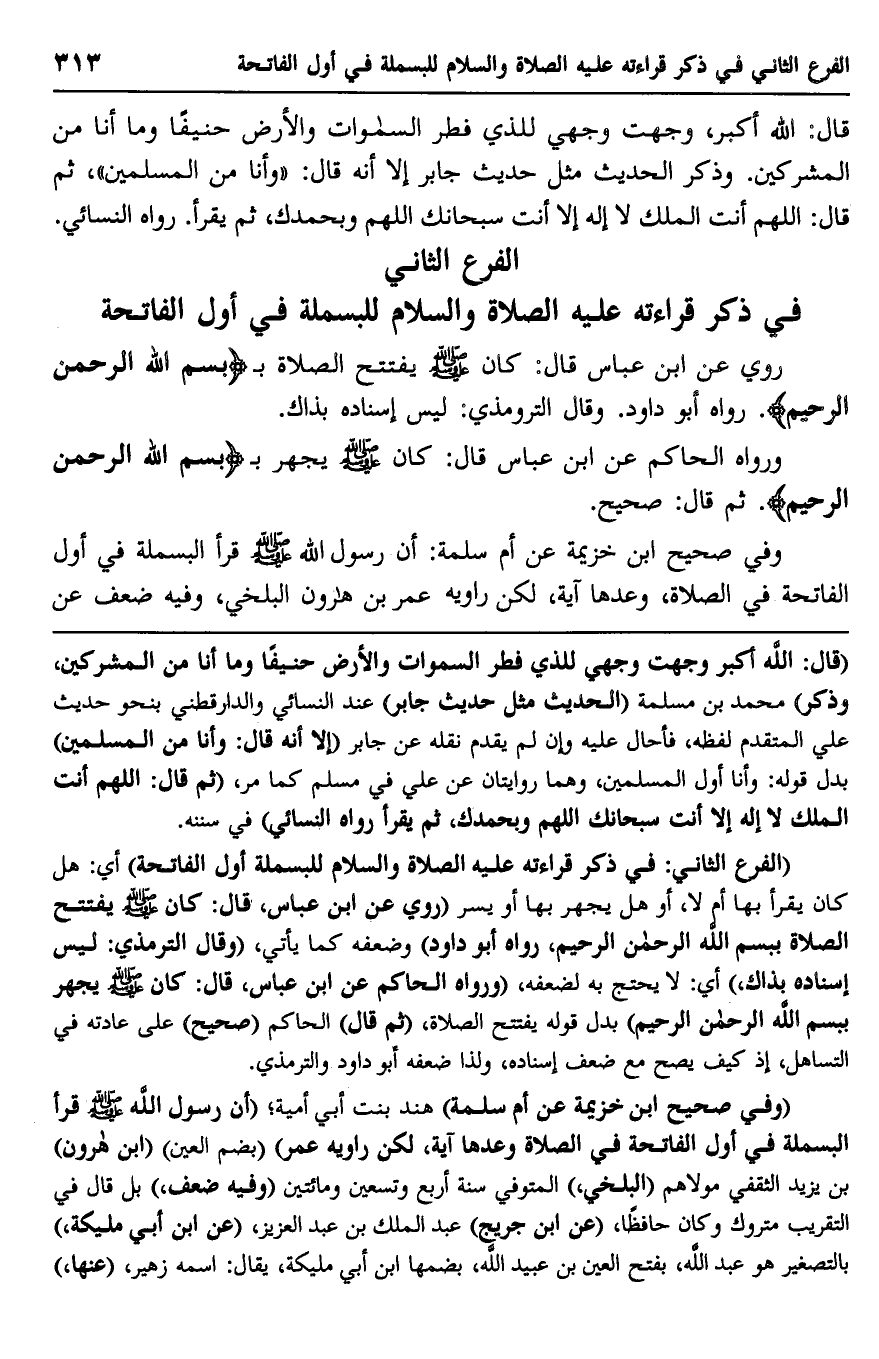 "الفرع الثاني: في ذكر قراءته عليه الصلاة والسلام للبسملة أو الفاتحة" أي: هل كان يقرأ بها أم لا، أو هل يجهر بها أو يسر "روي عن ابن عباس، قال: كان صلى الله عليه وسلم يفتتح الصلاة بـ {بِسْمِ اللَّهِ الرَّحْمَنِ الرَّحِيمِ} ، رواه أبو داود" وضعفه كما يأتي، "وقال الترمذي: ليس إسناده بذاك" أي: لا يحتج به لضعفه، "ورواه الحاكم عن ابن عباس، قال: كان صلى الله عليه وسلم يجهر بـ {بِسْمِ اللَّهِ الرَّحْمَنِ الرَّحِيمِ} " بدل قوله يفتتح الصلاة، "ثم قال" الحاكم "صحيح" على عادته في التساهل، إذ كيف يصح مع ضعف إسناده، ولذا ضعفه أبو داود والترمذي.