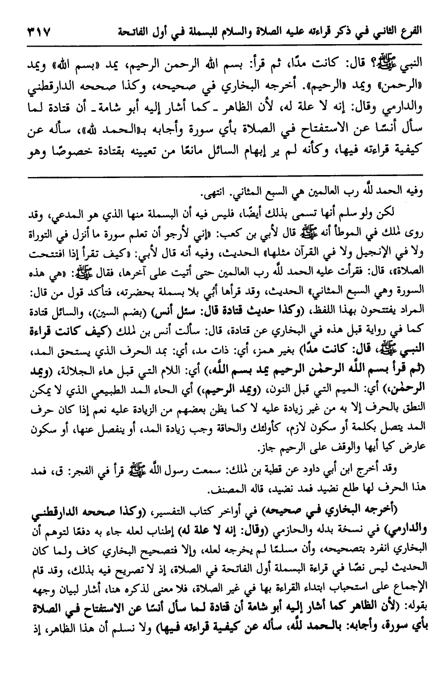 النبي صلى الله عليه وسلم؟ قال: كانت مدا، ثم قرأ: {بِسْمِ اللَّهِ الرَّحْمَنِ الرَّحِيمِ} ، يمد "بسم الله" ويمد "الرحمن" ويمد "الرحيم". أخرجه البخاري في صحيحه، وكذا صححه الدارقطني والدارمي وقال: إنه لا علة له، لأن الظاهر -كما أشار إليه أبو شامة- أن قتادة لما سأل أنسا عن الاستفتاح في الصلاة بأي سورة وأجابه بـ {الْحَمْدُ لِلَّهِ} ، سأله عن كيفية قراءته فيها، وكأنه لم ير إبهام السائل مانعا من تعيينه بقتادة خصوصا وهو