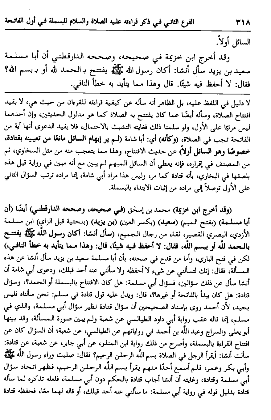 "وقد أخرج ابن زيمة" محمد بن إسحاق "في صحيحه، وصحح الدارقطني" أيضا "أن أبا مسلمة"، "بفتح الميم" سعيد "بكسر العين"، "بن يزيد"، "بتحتية قبل الزاي" ابن مسلمة الأزدي، البصري القصير، ثقة، من رجال الجميع، سأل أنسا: أكان رسول الله صلى الله عليه وسلم يفتتح بـ {الْحَمْدُ لِلَّهِ} أو بـ {بِسْمِ اللَّهِ} ؟ فقال: لا أحفظ فيه شيئا، قال: وهذا مما يتأيد به خطأ النافي", لكن في فتح الباري، وأما من قدح في صحته، بأن أبا مسلمة سعيد بن يزيد سأل أنسا عن هذه المسألة، فقال: إنك لتسألني عن شيء لا أحفظه ولا سألني عنه أحد قبلك، ودعوى أبي شامة أن أنسا سأل عن ذلك سؤالين، فسؤال أبي مسلمة: هل كان الافتتاح بالبسملة أو الحمد؟ وسؤال قتادة: هل كان يبدأ بالفاتحة أو غيرها؟ قال: ويدل عليه قول قتادة في مسلم: نحن سألناه. فليس بجيد، لأن أحمد روى بإسناد الصحيحين أن سؤال قتادة نظير سؤال أبي مسلمة، والذي في مسلم، إنما قاله عقب رواية أبي داود الطيالسي عن شعبة ولم يبين صورة المسألة، وقد بينها أبو يعلى والسراج وعبد الله بن أحمد في روايتهم عن الطيالسي، عن شعبة، أن السؤال كان عن افتتاح القراءة بالبسملة، وأصرح من ذلك رواية ابن المنذر، عن أبي جابر، عن شعبة، عن قتادة: سألت أنسا: أيقرأ الرجل في الصلاة {بِسْمِ اللَّهِ الرَّحْمَنِ الرَّحِيمِ} ؟ فقال: صليت وراء رسول الله صلى الله عليه وسلم وأبي بكر وعمر، فلم أسمع أحدا منهم يقرأ {بِسْمِ اللَّهِ الرَّحْمَنِ الرَّحِيمِ} ، فظهر اتحاد سؤال أبي مسلمة وقتادة، وغايته أن أنسا أجاب قتادة بالحكم دون أبي مسلمة، فلعله تذكره لما سأله قتادة بدليل قوله في رواية أبي مسلمة: ما سألني عنه أحد قبلك، أو قاله لهما معا، فحفظه قتادة