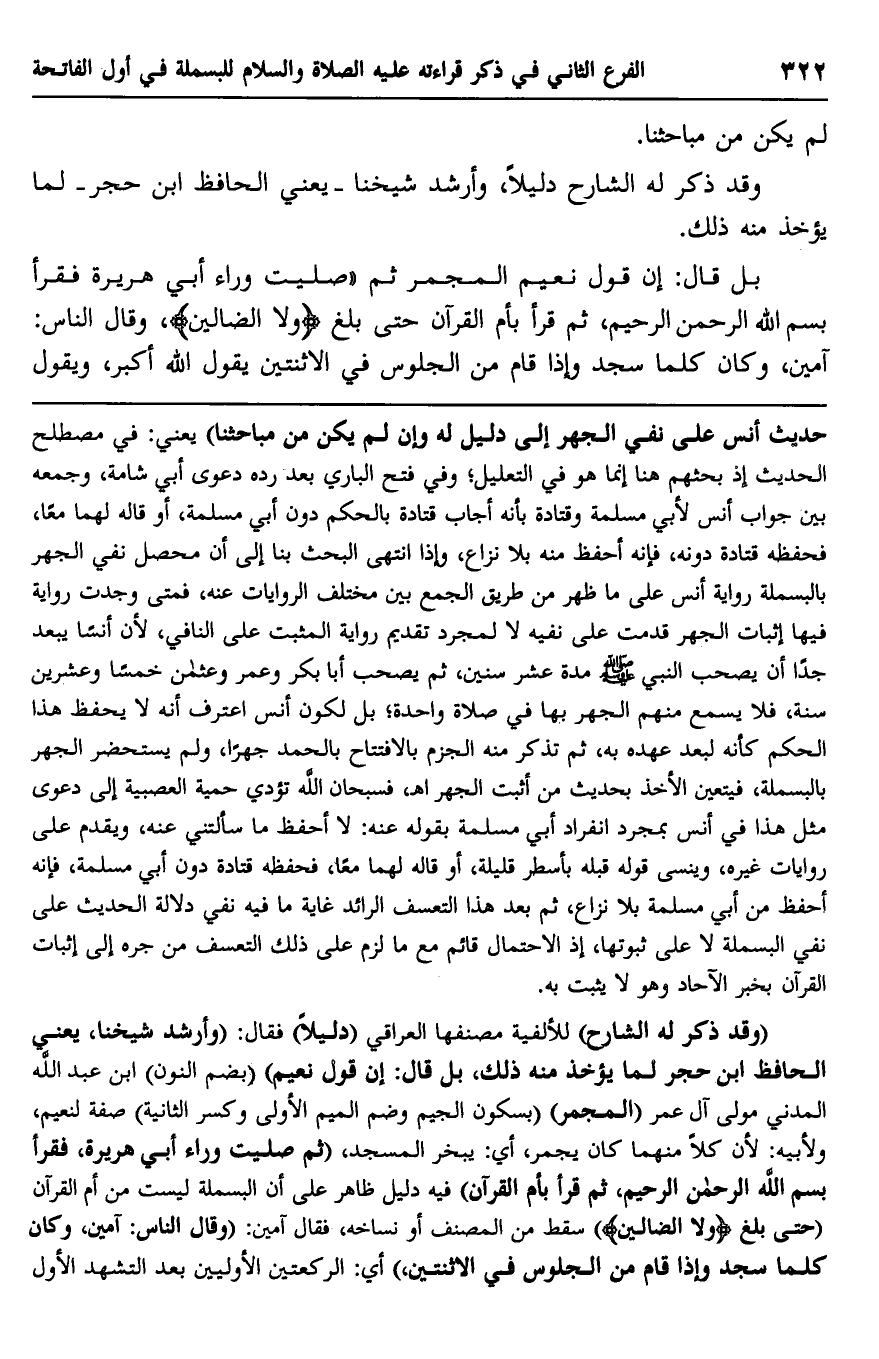 حديث أنس على نفي الجهر إلى دليل له وإن لم يكن من مباحثنا" يعني: في مصطلح الحديث إذ بحثهم هنا إنما هو في التعليل، وفي فتح الباري بعد رده دعوى أبي شامة، وجمعه بين جواب أنس لأبي مسلمة وقتادة بأنه أجاب قتادة بالحكم دون أبي مسلمة، أو قاله لهما معا، فحفظه قتادة دونه، فإنه أحفظ منه بلا نزاع، وإذا انتهى البحث بنا إلى أن محصل نفي الجهر بالبسملة رواية أنس على ما ظهر من طريق الجمع بين مختلف الروايات عنه، فمتى وجدت رواية فيها إثبات الجهر قدمت على نفيه لا لمجرد تقديم رواية المثبت على النافي، لأن أنسا يبعد جدا أن يصحب النبي صلى الله عليه وسلم مدة عشر سنين، ثم يصحب أبا بكر وعمر وعثمان خمسا وعشرين سنة، فلا يسمع منهم الجهر بها في صلاة واحدة، بل لكون أنس اعترف أنه لا يحفظ هذا الحكم كأنه لبعد عهده به، ثم تذكر منه الجزم بالافتتاح بالحمد جهرا، ولم يستحضر الجهر بالبسملة، فيتعين الأخذ بحديث من أثبت الجهر. ا. هـ. فسبحان الله تؤدي حمية العصبية إلى دعوى مثل هذا في أنس بمجرد انفراد أبي مسلمة بقوله عنه: لا أحفظ ما سألتني عنه، ويقدم على روايات غيره، وينسى قوله قبله بأسطر قليلة، أو قاله لهما معا، فحفظه قتادة دون أبي مسلمة، فإنه أحفظ من أبي مسلمة بلا نزاع، ثم بعد هذا التعسف الرائد غاية ما فيه نفي دلالة الحديث على نفي البسملة لا على ثبوتها، إذ الاحتمال قائم مع ما لزم على ذلك التعسف من جره إلى إثبات القرآن بخبر الآحاد وهو لا يثبت به.