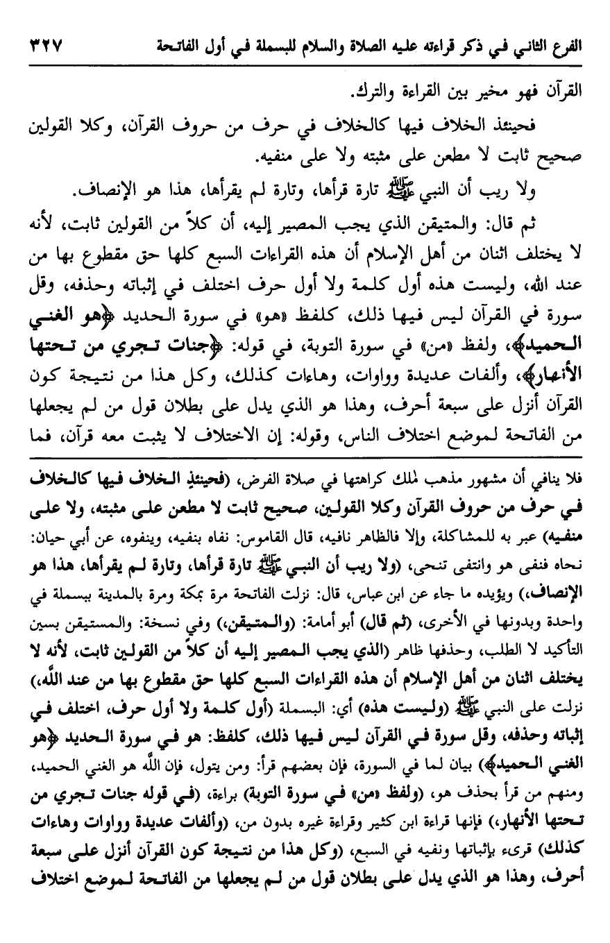 فلا ينافي أن مشهور مذهب مالك كراهتها في صلاة الفرض، "فيحنئذ الخلاف فيها كالخلاف في حرف من حروف القرآن وكلا القولين صحيح ثابت لا مطعن على مثبته، ولا على منفيه" عبر به للمشاكلة، وإلا فالظاهر نافيه، قال القاموس: نفاه ينفيه، وينفوه، عن أبي حيان: نحاه فنفي هو وانتفى تنحى، "ولا ريب أن النبي صلى الله عليه وسلم تارة قرأها، وتارة لم يقرأها، هذا هو الإنصاف" ويؤيده ما جاء عن ابن عباس، قال: نزلت الفاتحة مرة بمكة ومرة بالمدينة ببسملة في واحدة وبدونها في الأخرى، "ثم قال" أبو أمامة: "والمتيقن" وفي نسخة: والمستيقن بسين التأكيد لا الطلب، وحذفها ظاهر "الذي يجب المصير إليه أن كلا من القولين ثابت، لأنه لا يختلف اثنان من أهل الإسلام أن هذه القراءات السبع كلها حق مقطوع بها من عند الله" نزلت على النبي صلى الله عليه وسلم "وليست هذه" أي: البسملة "أول كلمة ولا أول حرف اختلف في إثباته وحذفه، وقل سورة في القرآن ليس فيه ذلك، كلفظ: هو في سورة الحديد {هُوَ الْغَنِيُّ الْحَمِيدُ} بيان لما في السورة، فإن بعضهم قرأ: {وَمَنْ يَتَوَلَّ فَإِنَّ اللَّهَ هُوَ الْغَنِيُّ الْحَمِيدُ} ، ومنهم من قرأ بحذف هو، "ولفظ "من" في سورة التوبة" براءة، "في قوله: "جَنَّاتٍ تَجْرِي من تَحْتِهَا الْأَنْهَارُ", فإنها قراءة ابن كثير وقراءة غيره بدون من، "وألفات عديدة وواوات وهاءات كذلك" قرئ بإثباتها ونفيها في السبع، "وكل هذا من نتيجة كون القرآن أنزل على سبعة أحرف، وهذا هو الذي يدل على بطلان قول من لم يجعلها من الفاتحة لموضع اختلاف