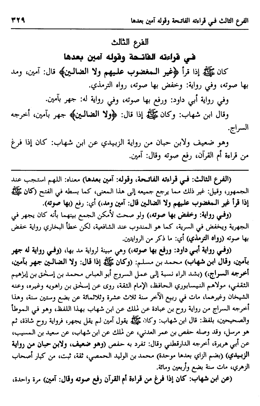 "الفرع الثالث: في قراءته الفاتحة، وقوله: آمين بعدها" معناه: اللهم استجب عند الجمهور، وقيل: غير ذلك مما يرجع جميعه إلى هذا المعنى، كما بسطه في الفتح "كان صلى الله عليه وسلم إذا قرأ {غَيْرِ الْمَغْضُوبِ عَلَيْهِمْ وَلا الضَّالِّينَ} قال: "آمين". ومد" أي: رفع "بها صوته".