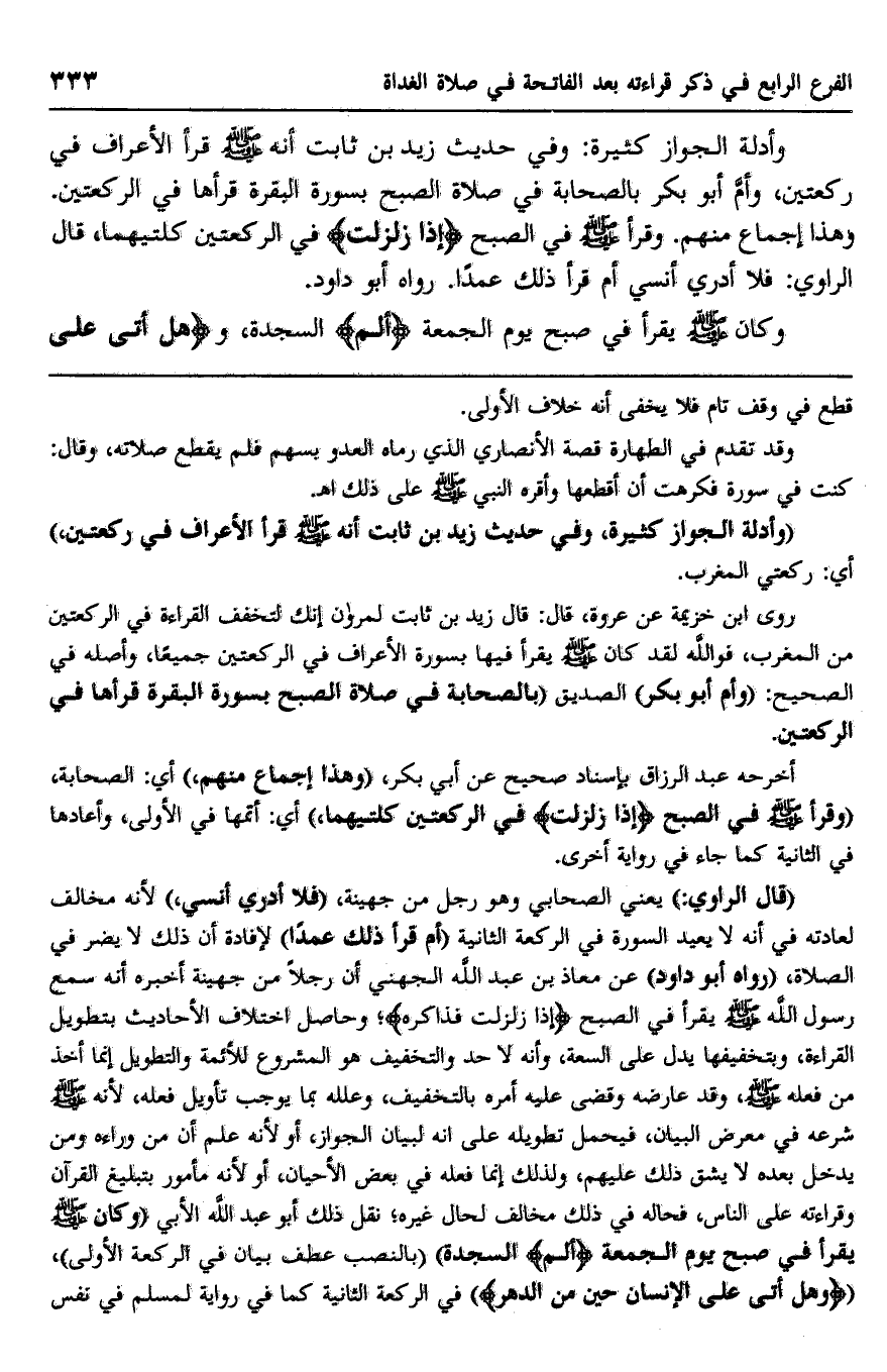وكان صلى الله عليه وسلم يقرأ في صبح يوم الجمعة {الم} السجدة، و {هَلْ أَتَى عَلَى