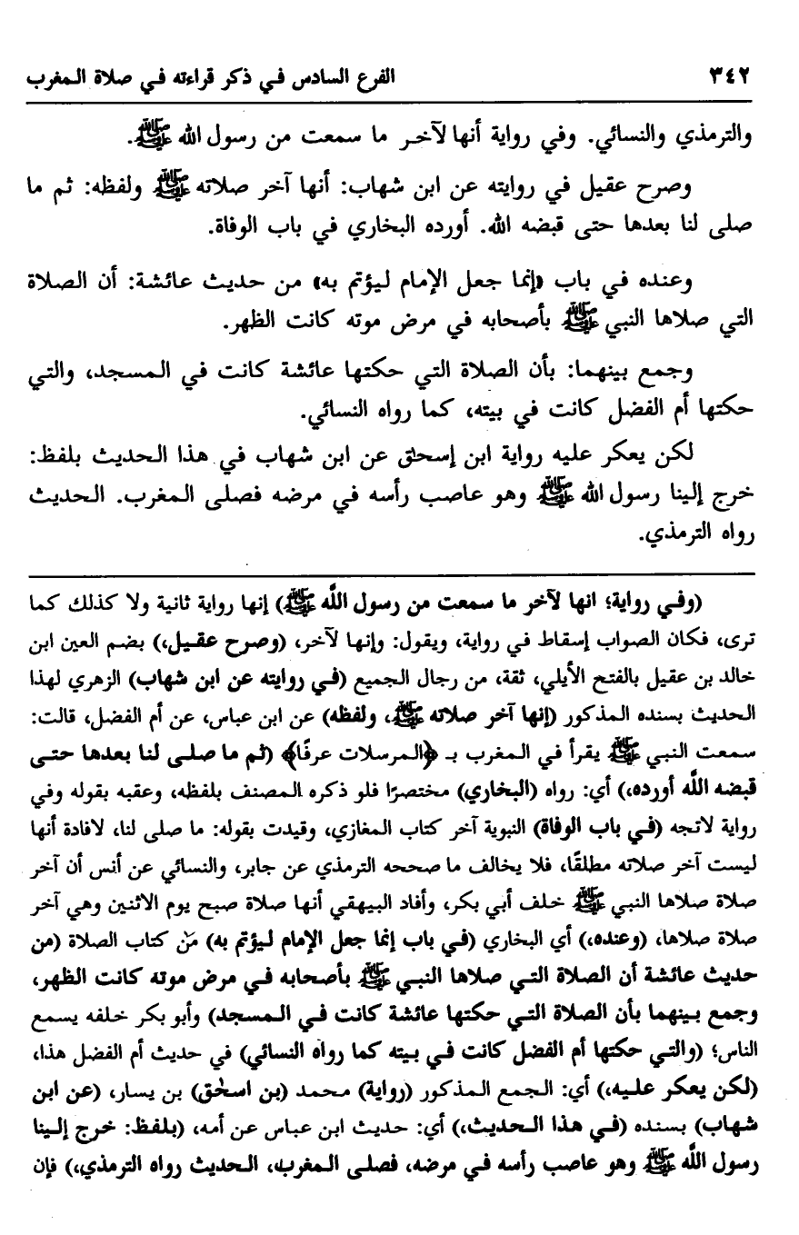 لكن يعكر عليه رواية ابن إسحاق عن ابن شهاب في هذا الحديث بلفظ: خرج إلينا رسول الله صلى الله عليه وسلم وهو عاصب رأسه في مرضه فصلى المغرب، الحديث رواه الترمذي.