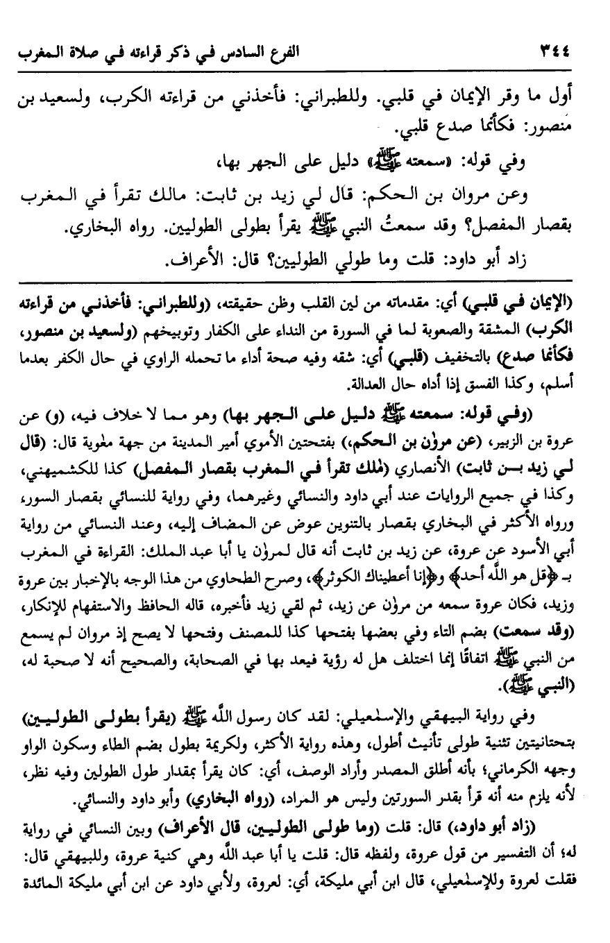 وعن مروان بن الحكم: قال لي زيد بن ثابت: ما لك تقرأ في المغرب بقصار المفصل؟ وقد سمعت النبي صلى الله عليه وسلم يقرأ بطولى الطوليين. رواه البخاري.
