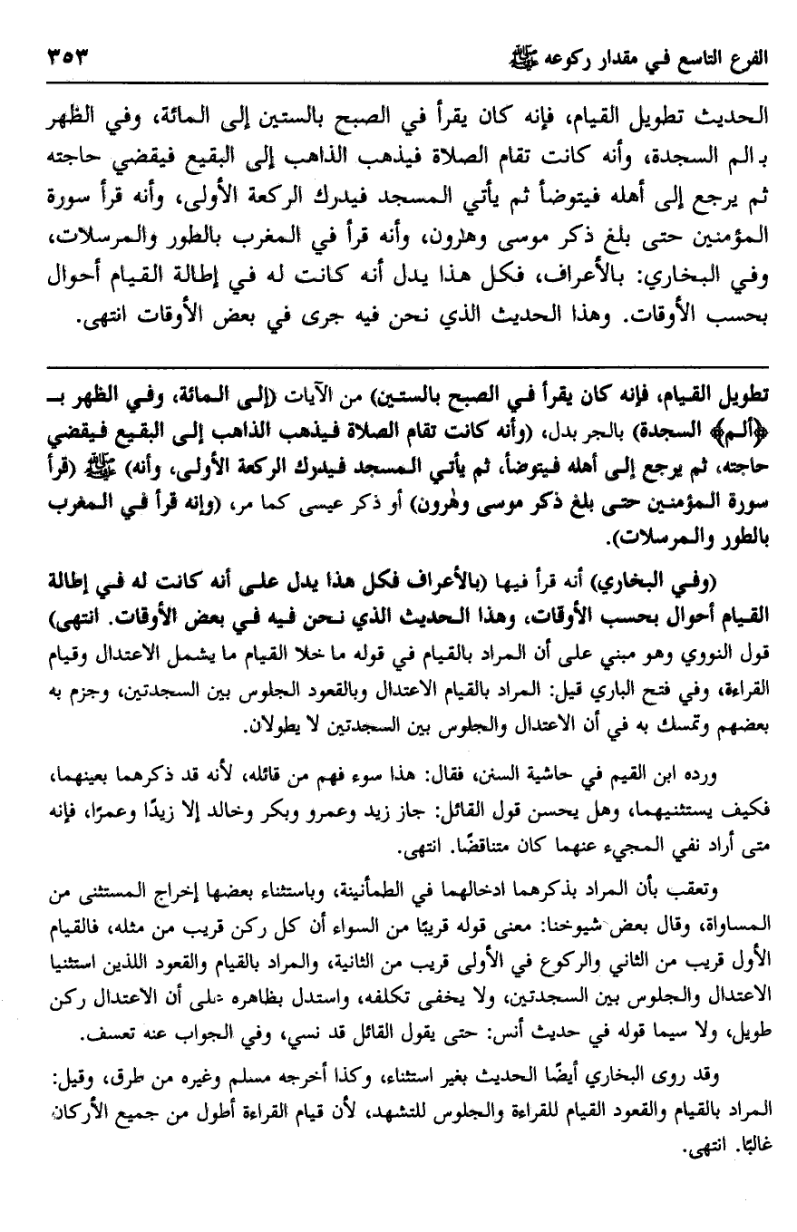 "وفي البخاري" أنه قرأ فيها "بالأعراف فكل هذا يدل على أنه كانت له في إطالة القيام أحوال بحسب الأوقات، وهذا الحديث الذي نحن فيه في بعض الأوقات. انتهى" قول النووي وهو مبني على أن المراد بالقيام في قوله ما خلا القيام ما يشمل الاعتدال وقيام القراءة، وفي فتح الباري قيل: المراد بالقيام الاعتدال وبالقعود الجلوس بين السجدتين، وجزم به بعضهم وتمسك به في أن الاعتدال والجلوس بين السجدتين لا يطولان.
