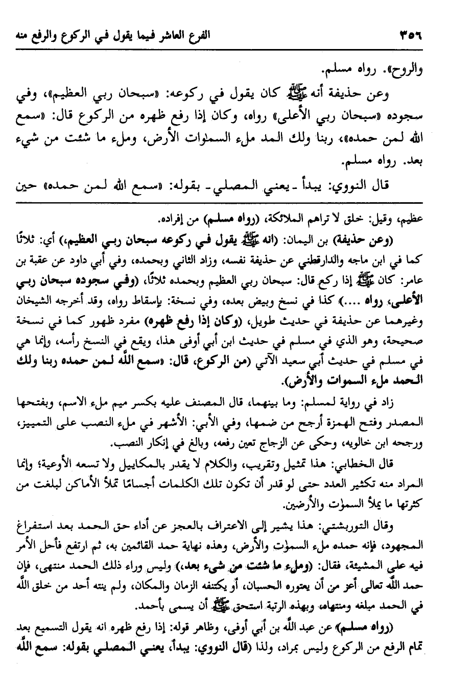 وعن حذيفة أنه صلى الله عليه وسلم كان يقول في ركوعه: "سبحان ربي العظيم"، وفي سجوده "سبحان ربي الأعلى" رواه، وكان إذا رفع ظهره من الركوع قال: "سمع الله لمن حمده ربنا ولك الحمد ملء السموات الأرض، وملء ما شئت من شيء بعد". رواه مسلم.