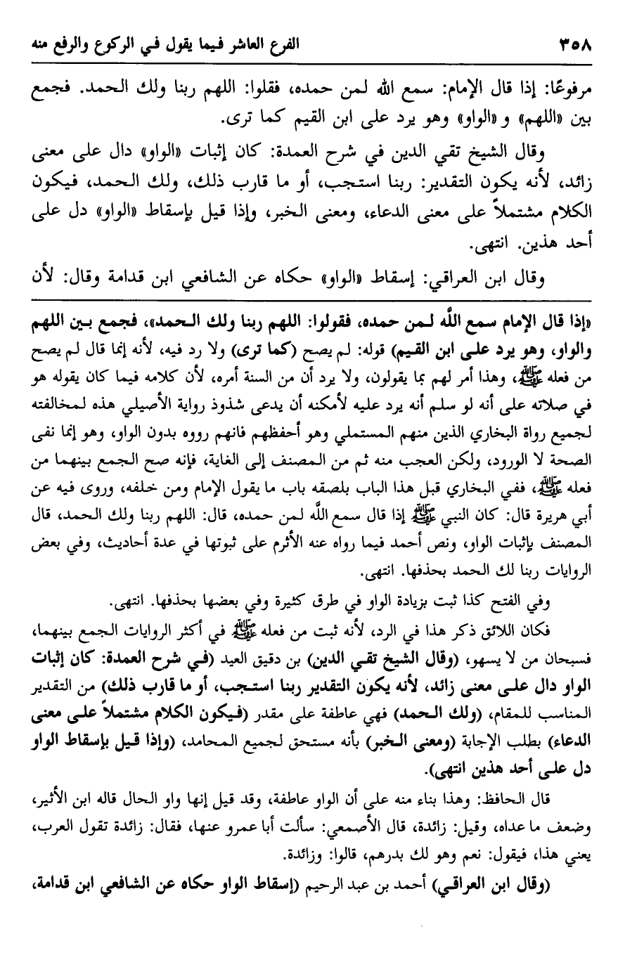 مرفوعا: "إذا قال الإمام: سمع الله لمن حمده، فقلوا: اللهم ربنا ولك الحمد". فجمع بين "اللهم" و"الواو" وهو يرد على ابن القيم كما ترى.