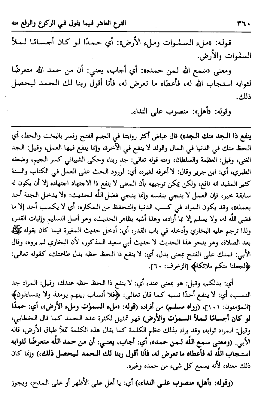 أي: بدلكم، وقيل: هو بمعنى عند، أي: لا ينفع ذا الحظ حظه عندك، وقيل: المراد جد النسب، أي: لا ينفع أدًا نسبه كما قال تعالى: {فَلَا أَنْسَابَ بَيْنَهُمْ يَوْمَئِذٍ وَلَا يَتَسَاءَلُونَ} [المؤمنون: 101] "رواه مسلم" من أفراده "قوله: "ملء السموات وملء الأرض" أي: حمدا لو كان أجساما لملأ السموات والأرض" فهو تمثيل لكثرة عدد الحمد كما قال الخطابي، وقيل: المراد ثوابه، وقد يراد بذلك عظم الكلمة كما يقال هذه الكمة تملأ طباق الأرض، قاله الأبي. "ومعنى سمع الله لمن حمده، أي: أجاب، يعني: أن من حمد الله متعرضا لثوابه استجاب الله له فأعطاه ما تعرض له، فأنا أقول ربنا لك الحمد ليحصل ذلك" وإنما كان ذلك معناه، لأن سمع كل شيء من حمده وغيره.
