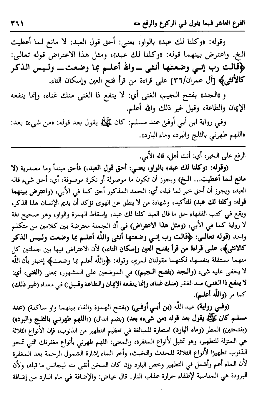 "وقوله: "وكلنا لك عبد" بالواو، يعني: أحق قول العبد" فأحق مبتدأ وما مصدرية "لا مانع لما أعطيت ... إلخ " ويجوز أن تكون ما موصولة أو نكرة موصوفة، أي: أحق شيء قاله العبد، ويجوز أن أحق خبر لما قبله، أي: الحمد المذكور أحق كما في الأبي، "واعترض بينهما قوله: "وكلنا لك عبد" للتأكيد، وشهادة من لا ينطق عن الهوى تؤكد أن يديم الإنسان هذا الذكر، ويقع في كتب الفقهاء حق ما قال العبد كلنا لك عب، بإسقاط الهمزة والواو، وهو صحيح لغة لا رواية كما في الأبي، "ومثل هذا الاعتراض" في أن الجملة معترضة بين كلامين من متكلم واحد "قوله تعالى: {قَالَتْ رَبِّ إِنِّي وَضَعْتُهَا أُنْثَى وَاللَّهُ أَعْلَمُ بِمَا وَضَعَتْ وَلَيْسَ الذَّكَرُ كَالأُنْثَى} على قراءة من قرأ بفتح العين وإسكان التاء" لأن الاعتراض فيها بين جملتين كل منهما مستقلة بنفسها، لكنهما مقولتان لمريم، وقوله: {وَاللَّهُ أَعْلَمُ بِمَا وَضَعَتْ} إخبار بأن الله لا يخفى عليه شيء "والجد "بفتح الجيم" في الموضعين على المشهور، بمعنى "الغنى، أي: لا ينفع ذا الغنى" ضد الفقر "منك غناه، وإنما ينفعه الإيمان والطاعة وقيل": في معناه "غير ذلك" كما مر "والله أعلم".