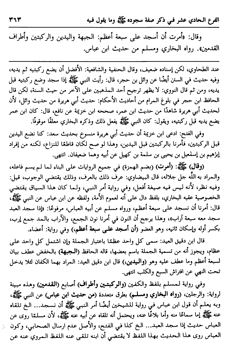 وقال: "أمرت أن أسجد على سبعة أعظم: الجبهة واليدين والركبتين وأطراف القدمين". رواه البخاري ومسلم من حديث ابن عباس.