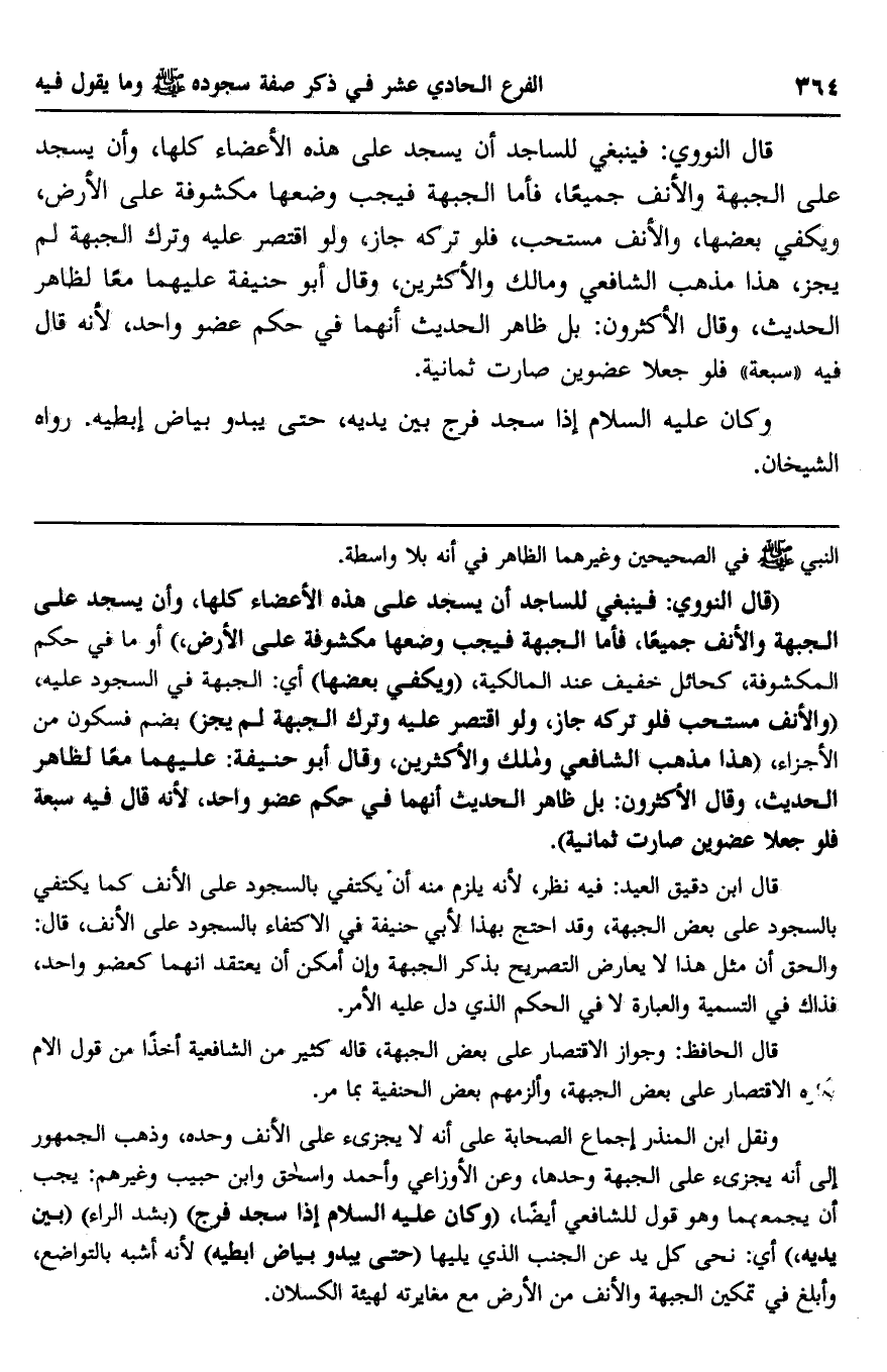 "قال النووي: فينبغي للساجد أن يسجد على هذه الأعضاء كلها، وأن يسجد على الجبهة والأنف جميعا، فأما الجبهة فيجب وضعها مكشوفة على الأرض" أو ما في حكم المكشوفة، كحائل خفيف عند المالكية، "ويكفي بعضها" أي: الجبهة في السجود عليه، "والأنف مستحب فلو تركه جاز، ولو اقتصر عليه وترك الجبهة لم يجز" بضم فسكون من الأجزاء، "هذا مذهب الشافعي ومالك والأكثرين، وقال أبو حنيفة: عليهما معا لظاهر الحديث، وقال الأكثرون: بل ظاهر الحديث أنهما في حكم عضو واحد، لأنه قال فيه سبعة فلو جعلا عضوين صارت ثمانية".