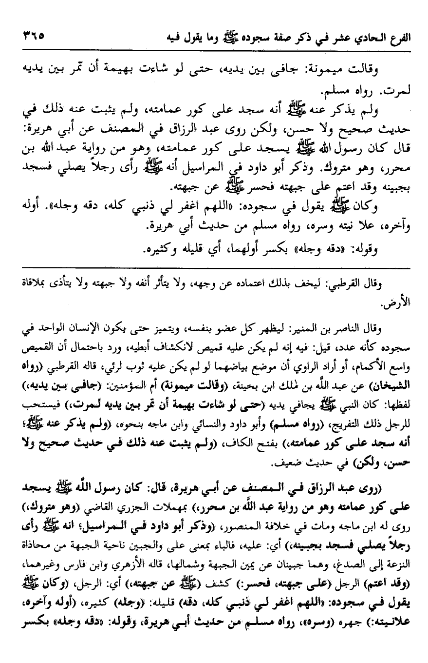 وقال الناصر بن المنير: ليظهر كل عضو بنفسه، ويتميز حتى يكون الإنسان الواحد في سجوده كأنه عدد، قيل فيه إنه لم يكن عليه قميص لانكشاف أبطيه، ورد باحتمال أن القميص واسع الأكمام، أو أراد الراوي أن موضع بياضهما لو لم يكن عليه ثوب لرئي، قاله القرطبي "رواه الشيخان" عن عبد الله بن مالك ابن بحينة، "وقالت ميمونة" أم المؤمنين: "جافى بين يديه"، لفظها: كان النبي صلى الله عليه وسلم يجافي يديه "حتى لو شاءت بهيمة أن تمر بين يديه لمرت"، فيستحب للرجل ذلك التفريج، "رواه مسلم" وأبو داود والنسائي وابن ماجه بنحوه، "ولم يذكر عنه صلى الله عليه وسلم، أنه سجد على كور عمامته" بفتح الكاف، "ولم يثبت عنه ذلك في حديث صحيح ولا حسن، ولكن" في حديث ضعيف.