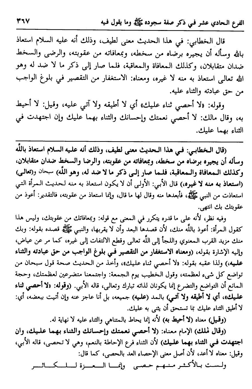 "قال الخطابي: في هذا الحديث معنى لطيف، وذلك أنه عليه السلام استعاذ بالله وسأله أن يجيره برضاه من سخطه، وبمعافاته من عقوبته، والرضا والسخط ضدان متقابلان، وكذلك المعافاة والمعاقبة، فلما صار إلى ذكر ما لا ضد له، وهو الله" سبحان و"تعالى"، "استعاذ به منه لا غيره" قال الأبي: الأولى أن لا يكون استعاذ به منه لحديث المرأة التي استعاذت من النبي صلى الله عليه وسلم فأبعدها منه وقال لها ما قال، وإنما استعاذ من عقوبته، فالتقدير: أعوذ من عقوبتك بك. انتهى.