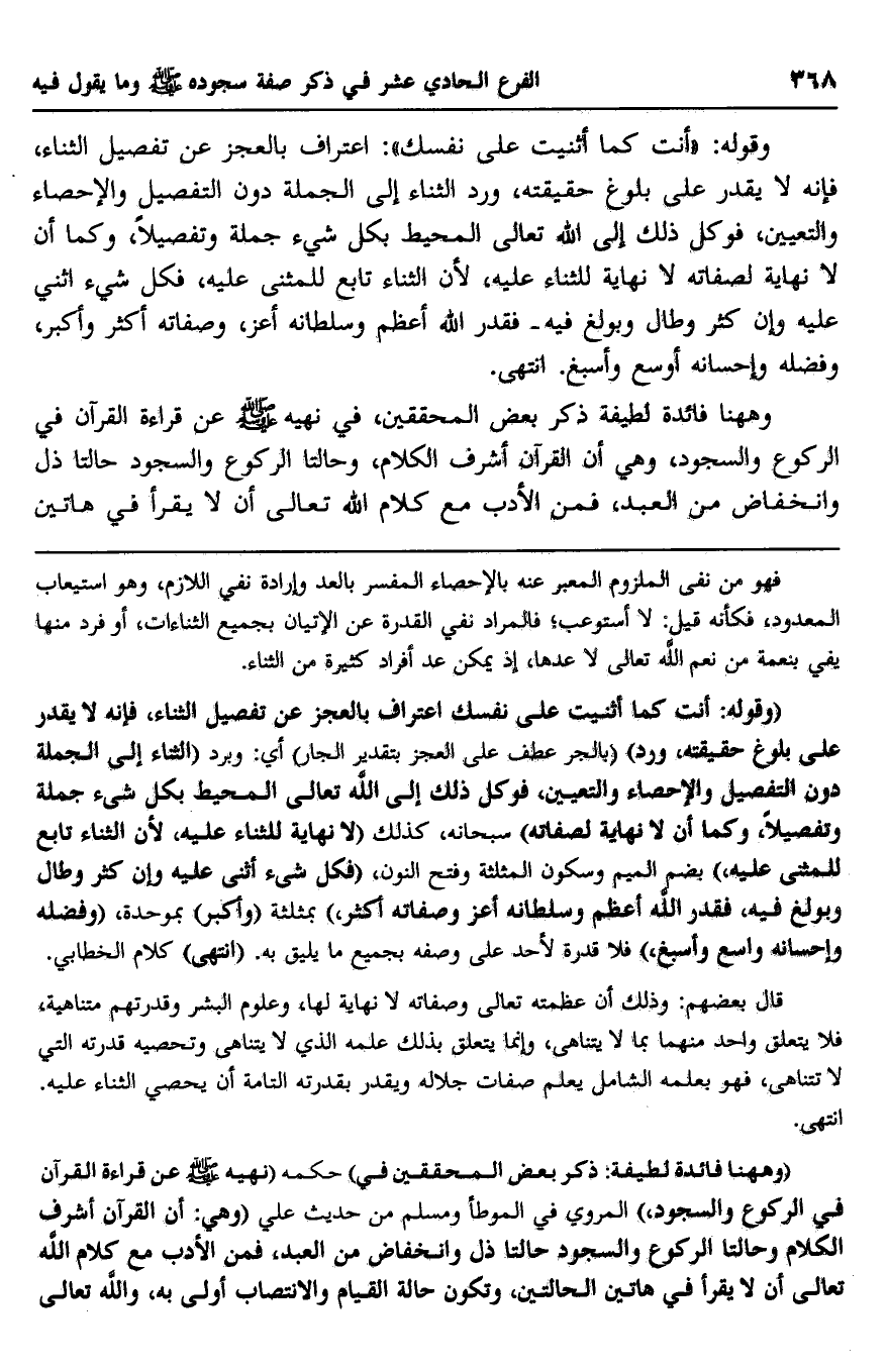 "وقوله: أنت كما أثنيت على نفسك اعتراف بالعجز عن تفصيل الثناء، فإنه لا يقدر على بلوغ حقيقته، ورد"، "بالجر عطف على العجز بتقدير الجار" أي: وبرد "الثناء إلى الجملة دون التفصيل والإحصاء والتعيين، فوكل ذلك إلى الله تعالى المحيط بكل شيء جملة وتفصيلا، وكما أن لا نهاية لصفاته" سبحانه، كذلك "لا نهاية للثناء عليه، لأن الثناء تابع للمثنى عليه" بضم الميم وسكون المثلثة وفتح النون، "فكل شيء أثنى عليه وإن كثر وطال وبولغ فيه، فقدر الله أعم وسلطانه أعز وصفاته أكثر" بمثلثة "وأكبر" بموحدة، "وفضله وإحسانه واسع وأسبغ" فلا قدرة لأحد على وصفه بجميع ما يليق به. "انتهى" كلام الخطابي.