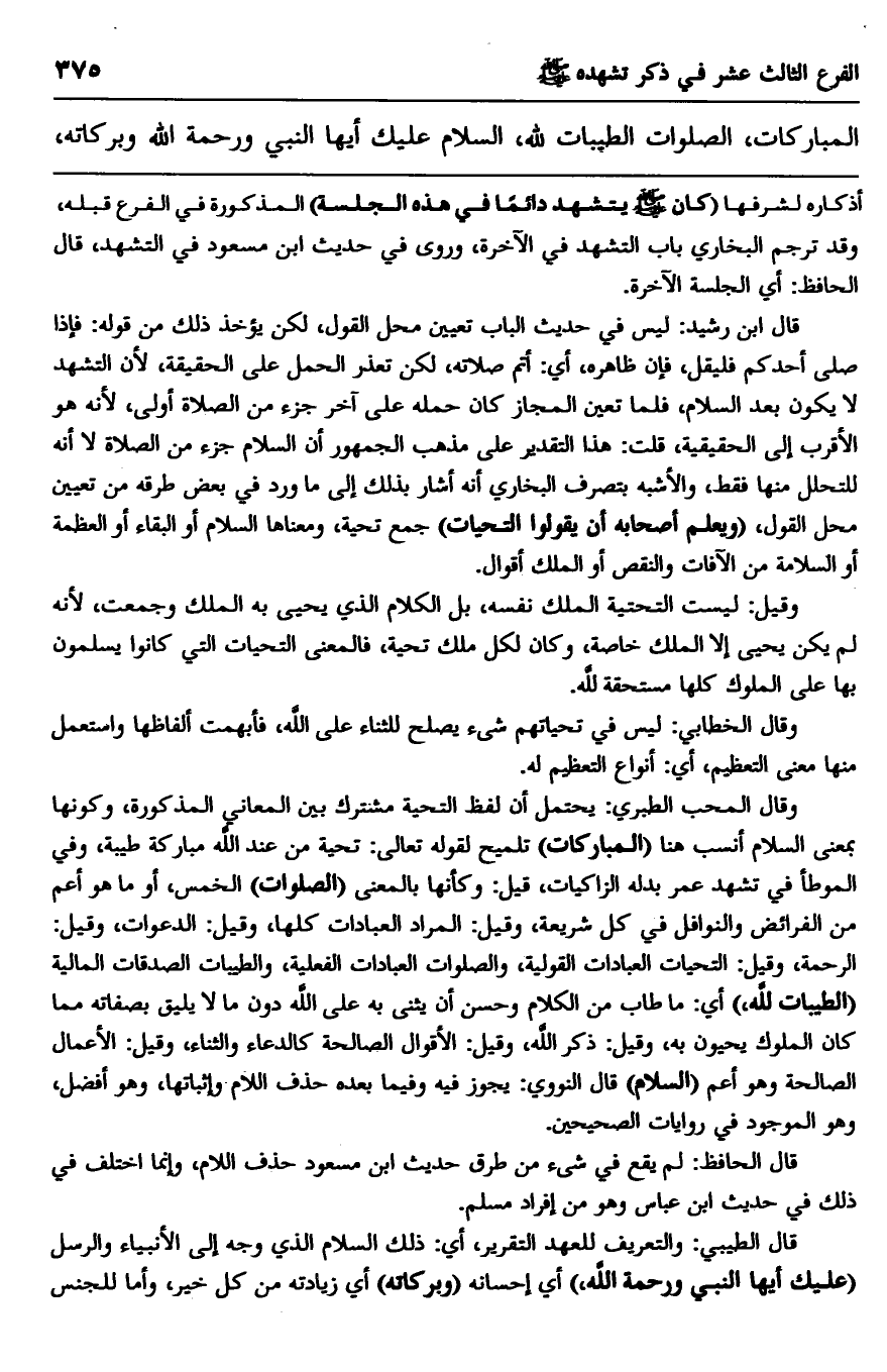 وقال المحب الطبري: يحتمل أن لفظ التحية مشترك بين المعاني المذكورة، وكونها بمعنى السلام أنسب هنا "المباركات" تلميح لقوله تعالى: {تَحِيَّةً مِنْ عِنْدِ اللَّهِ مُبَارَكَةً طَيِّبَةً} ، وفي الموطأ في تشهد عمر بدله الزاكيات، قيل: وكأنها بالمعنى "الصلوات" الخمس، أو ما هو أعم من الفرائض والنوافل في كل شريعة، وقيل: المراد العبادات كلها، وقيل: الدعوات، وقيل: الرحمة وقيل: التحيات العبادات القولية، والصلوات العبادات الفعلية، والطيبات الصدقات المالية "الطيبات لله" أي: ما طاب من الكلام وحسن أن يثنى به على الله دون ما لا يليق بصفاته ما كان الملوك يحيون به، وقيل: ذكر الله، وقيل: الأقوال الصالحة كالدعاء والثناء، وقيل: الأعمال الصالحة وهو أعم "السلام" قال النووي: يجوز فيه وفيما بعد حذف اللام وإثباتها، وهو أفضل، وهو الموجود في روايات الصحيحين.