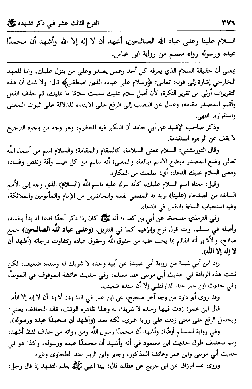 السلام علينا وعلى عباد الله الصالحين، أشهد أن لا إله إلا الله وأشهد أن محمدًا عبده ورسوله. رواه مسلم من رواية ابن عباس.