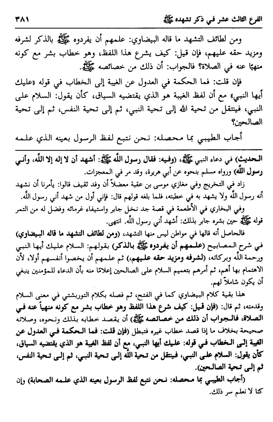 ومن لطائف التشهد ما قاله البيضاوي: علمهم أن يفردوه -صلى الله عليه وسلم- بالذكر لشرفه ومزيد حقه عليهم، فإن قيل: كيف يشرع هذا اللفظ، وهو خطاب بشر مع كونه منهيًا عنه في الصلاة؟ فالجواب: أن ذلك من خصائصه صلى الله عليه وسلم.