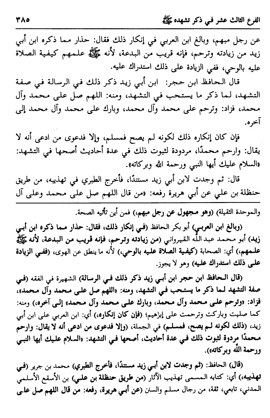 عن رجل مبهم، وبالغ ابن العربي في إنكار ذلك فقال: حذار مما ذكره ابن أبي زيد من زيادته وترحم، فإنه قريب من البدعة، لأنه صلى الله عليه وسلم علمهم كيفية الصلاة عليه بالوحي، ففي الزيادة على ذلك استدراك عليه.