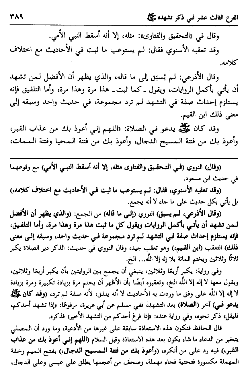 وقال الأذرعي: لم يُسبَق إلى ما قاله، والذي يظهر أن الأفضل لمن تشهد أن يأتي بأكمل الروايات، ويقول -كما ثبت- هذا مرة وهذا مرة، وأما التلفيق فإنه يستلزم إحداث صفة في التشهد لم ترد مجموعة، في حديث واحد وسبقه إلى معنى ذلك ابن القيم.