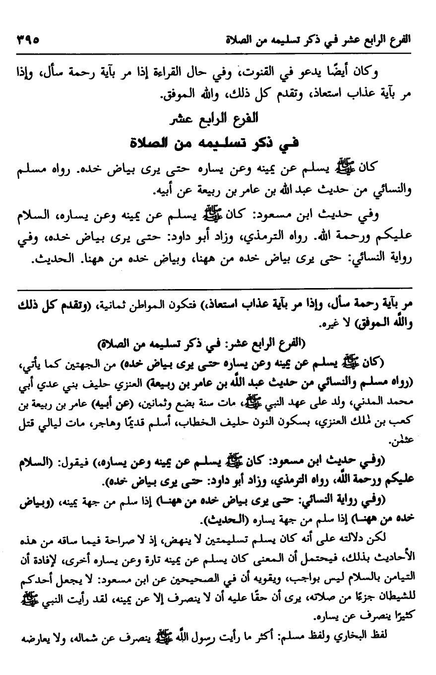 وفي حديث ابن مسعود: كان صلى الله عليه وسلم يسلم عن يمينه وعن يساره: "السلام عليكم ورحمة الله". رواه الترمذي، وزاد أبو داود: حتى يرى بياض خده، وفي رواية النسائي: حتى يرى بياض خده من ههنا، وبياض خده من ههنا. الحديث.