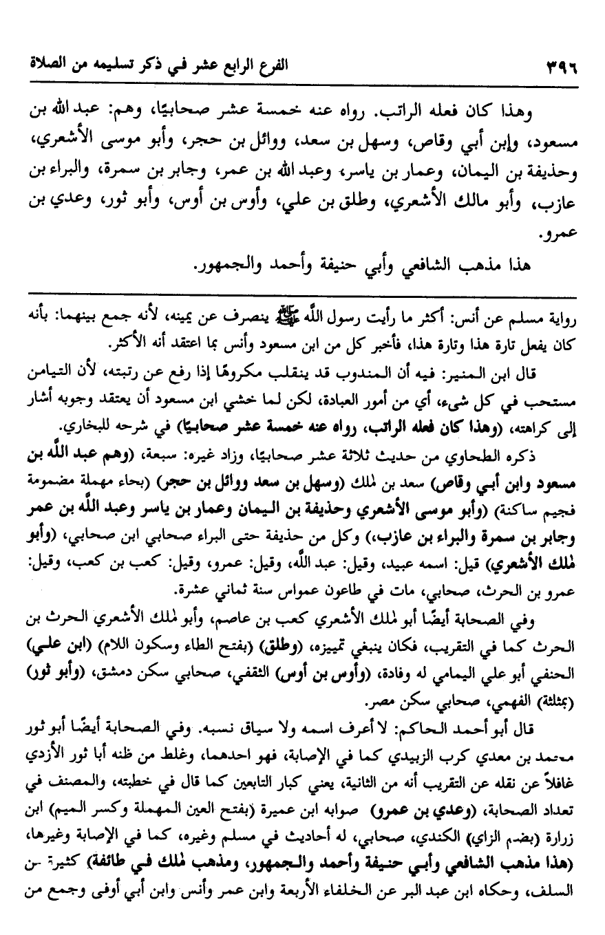ذكره الطحاوي من حديث ثلاثة عشر صحابيًا، وزاد غيره: سبعة، "وهم عبد الله بن مسعود وابن أبي وقاص" سعد بن مالك "وسهل بن سعد ووائل بن حجر"، "بحاء مهملة مضمومة فجيم ساكنة"، "وأبو موسى الأشعري وحذيفة بن اليمان وعمار بن ياسر وعبد الله بن عمر وجابر بن سمرة والبراء بن عازب"، وكل من حذيفة حتى البراء صحابي ابن صحابي، "وأبو مالك الأشعري" قيل اسمه عبيد، وقيل: عبد الله، وقيل: عمرو، وقيل: كعب بن كعب، وقيل: عمرو بن الحارث، صحابي، مات في طاعون عمواس سنة ثماني عشرة.
